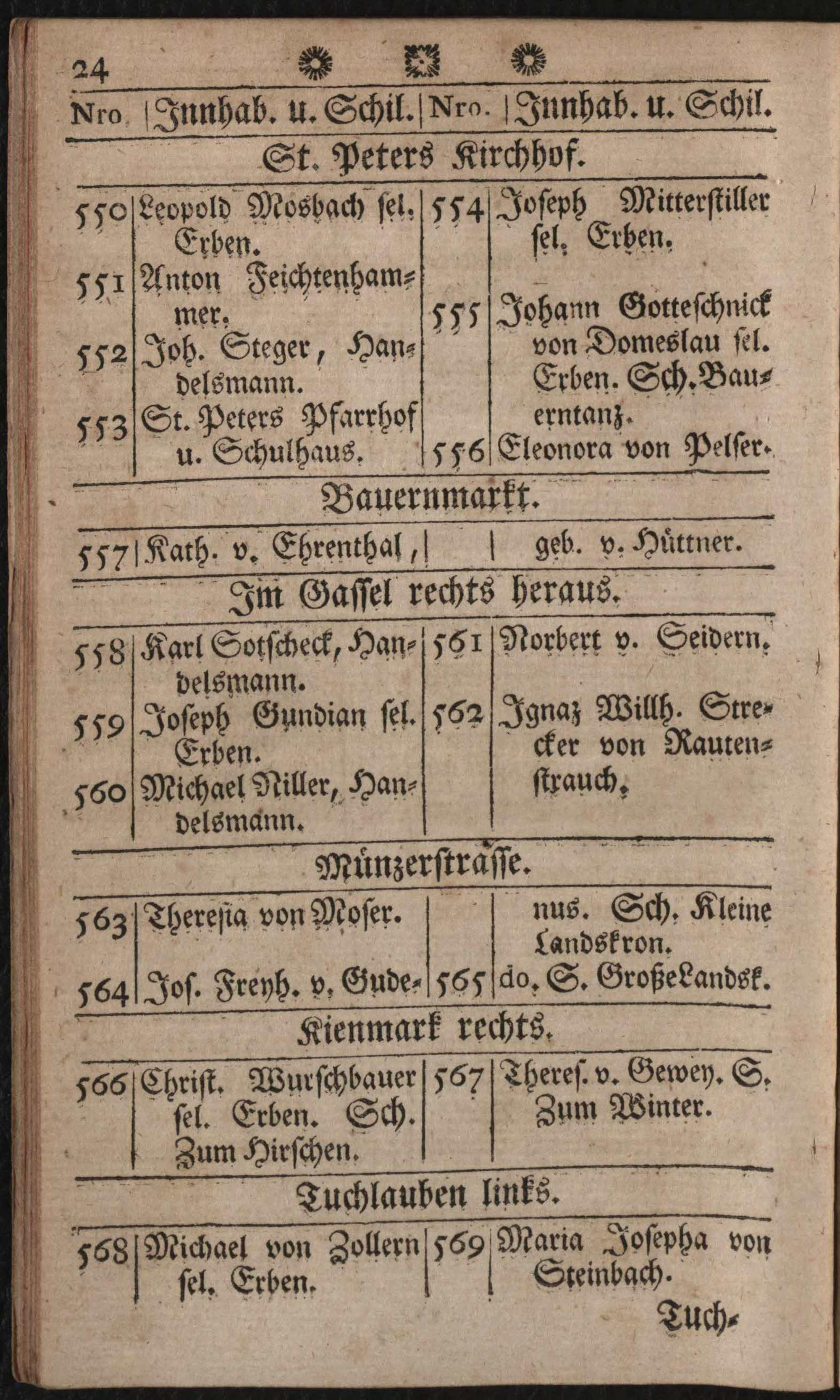 Verzeichniß der in der k. k. Haupt- und Residenzstadt Wien befindlichen Gassen, numerirten Häuser, Innhaber, und ihrer Schilde : sammt einer neuen verbesserten und zum sichersten Gebrauch bequem eingerichten Rechnungstabelle, worinn die Dukaten und Souveraind'ors, dann Niederländer Kronthaler, und Gulden, wie auch Siebenzehner und Siebner, zu fünf auf einen Wurf, alles von 1 bis 1000 enthalten sind