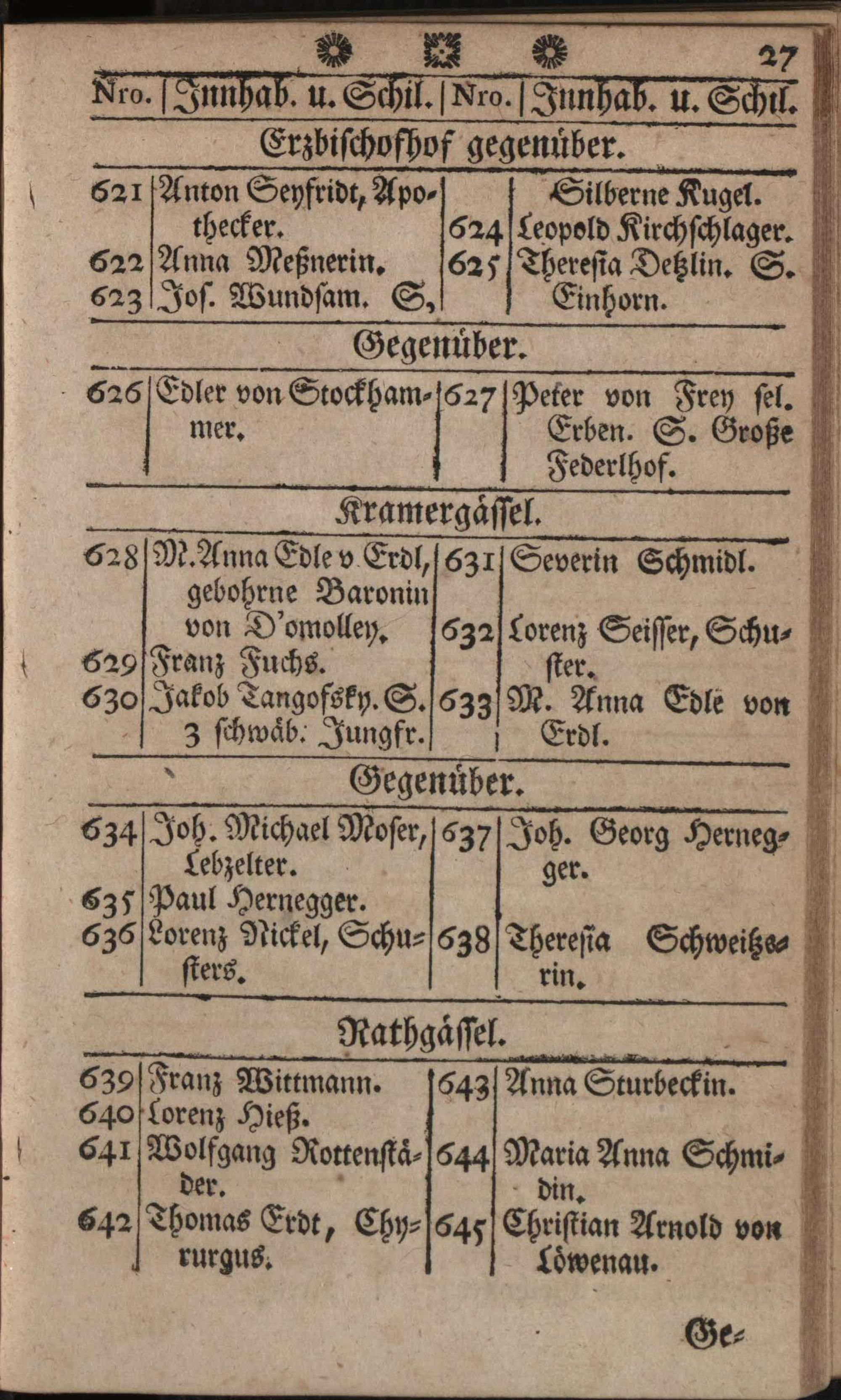 Verzeichniß der in der k. k. Haupt- und Residenzstadt Wien befindlichen Gassen, numerirten Häuser, Innhaber, und ihrer Schilde : sammt einer neuen verbesserten und zum sichersten Gebrauch bequem eingerichten Rechnungstabelle, worinn die Dukaten und Souveraind'ors, dann Niederländer Kronthaler, und Gulden, wie auch Siebenzehner und Siebner, zu fünf auf einen Wurf, alles von 1 bis 1000 enthalten sind