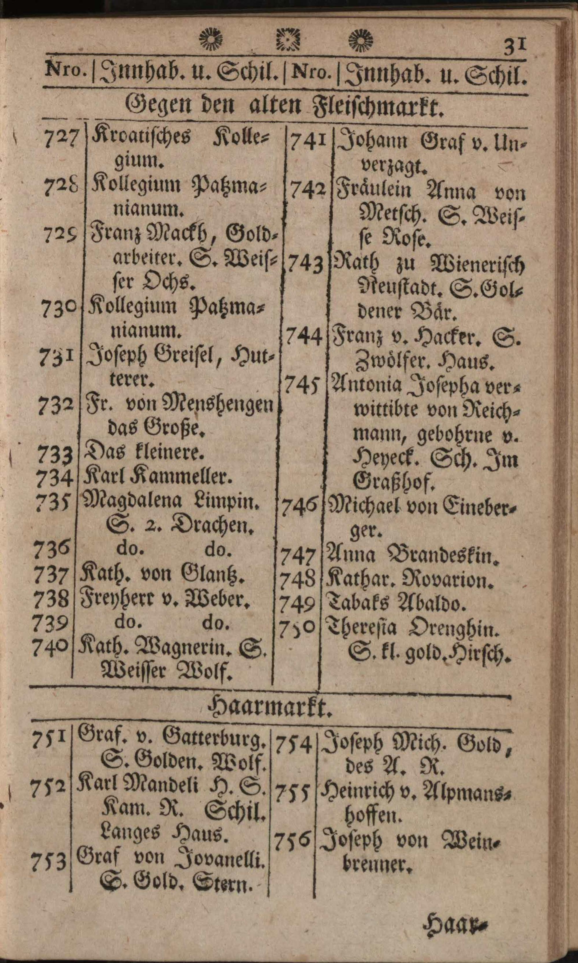 Verzeichniß der in der k. k. Haupt- und Residenzstadt Wien befindlichen Gassen, numerirten Häuser, Innhaber, und ihrer Schilde : sammt einer neuen verbesserten und zum sichersten Gebrauch bequem eingerichten Rechnungstabelle, worinn die Dukaten und Souveraind'ors, dann Niederländer Kronthaler, und Gulden, wie auch Siebenzehner und Siebner, zu fünf auf einen Wurf, alles von 1 bis 1000 enthalten sind
