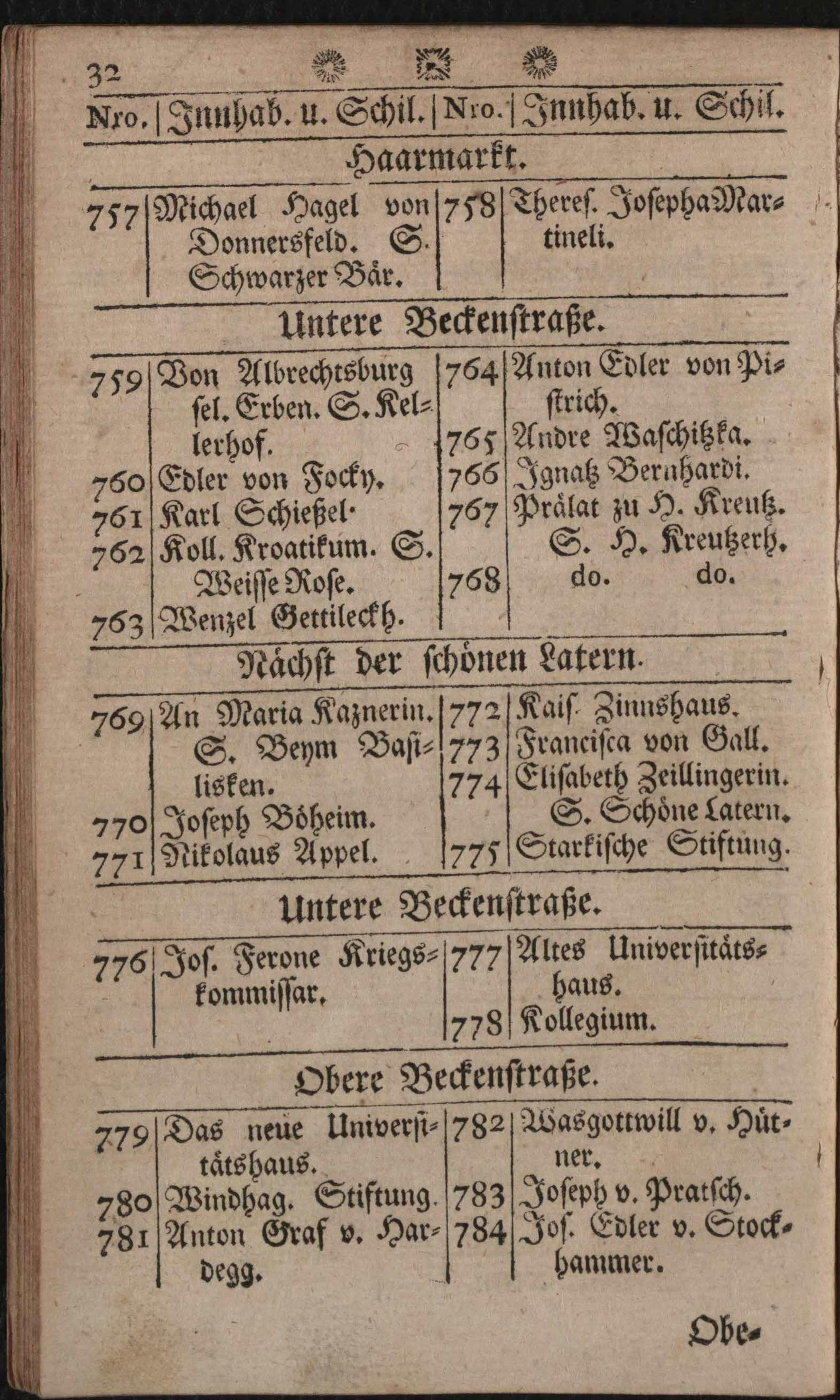 Verzeichniß der in der k. k. Haupt- und Residenzstadt Wien befindlichen Gassen, numerirten Häuser, Innhaber, und ihrer Schilde : sammt einer neuen verbesserten und zum sichersten Gebrauch bequem eingerichten Rechnungstabelle, worinn die Dukaten und Souveraind'ors, dann Niederländer Kronthaler, und Gulden, wie auch Siebenzehner und Siebner, zu fünf auf einen Wurf, alles von 1 bis 1000 enthalten sind