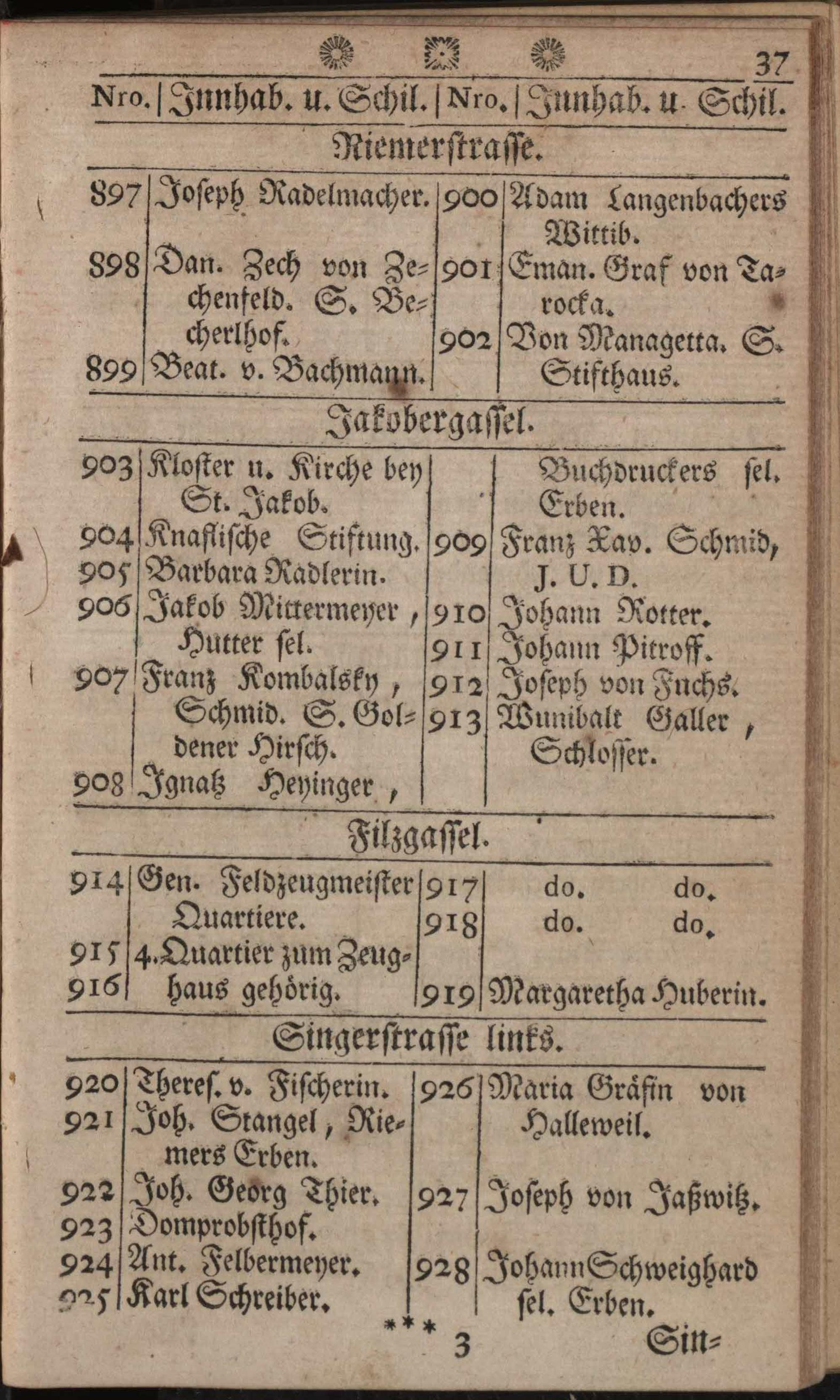 Verzeichniß der in der k. k. Haupt- und Residenzstadt Wien befindlichen Gassen, numerirten Häuser, Innhaber, und ihrer Schilde : sammt einer neuen verbesserten und zum sichersten Gebrauch bequem eingerichten Rechnungstabelle, worinn die Dukaten und Souveraind'ors, dann Niederländer Kronthaler, und Gulden, wie auch Siebenzehner und Siebner, zu fünf auf einen Wurf, alles von 1 bis 1000 enthalten sind