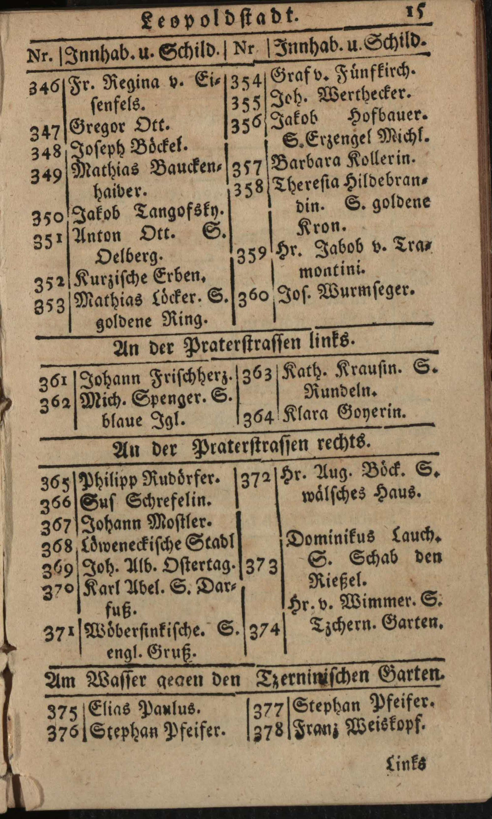 Verzeichniß der um die k.k. Haupt- und Residenzstadt Wien befindlichen Vorstädten, Gründen, Gässen, numerirten Häuser, Innhaber, und ihrer Schilde