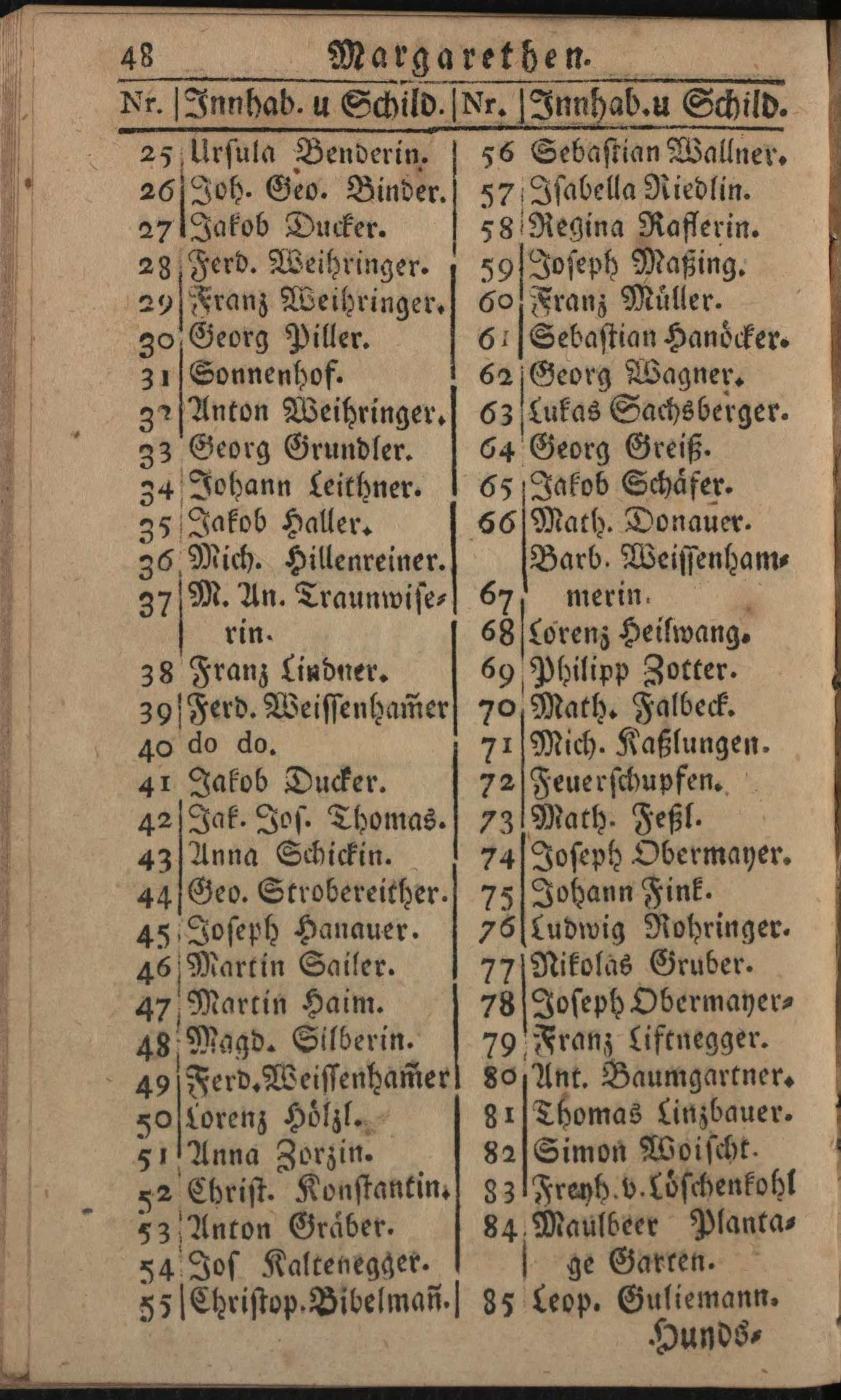 Verzeichniß der um die k.k. Haupt- und Residenzstadt Wien befindlichen Vorstädten, Gründen, Gässen, numerirten Häuser, Innhaber, und ihrer Schilde