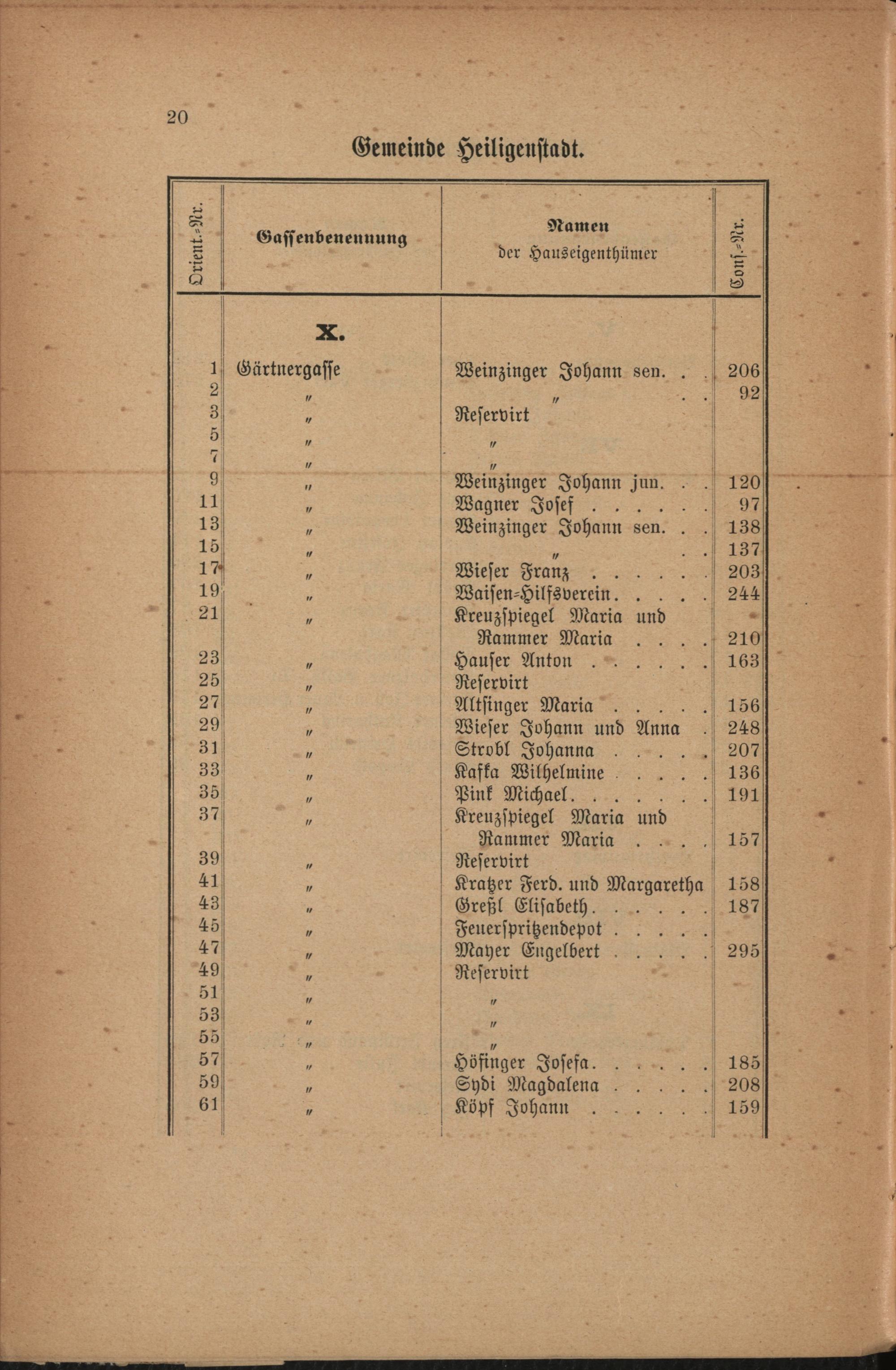 Orientirungs-Schema von Heiligenstadt : enthaltend die sämmtlichen alten Conscriptions-Nummern der Häuser und die gassenweise Numerirung derselben. Zusammengestellt am 31. März 1891