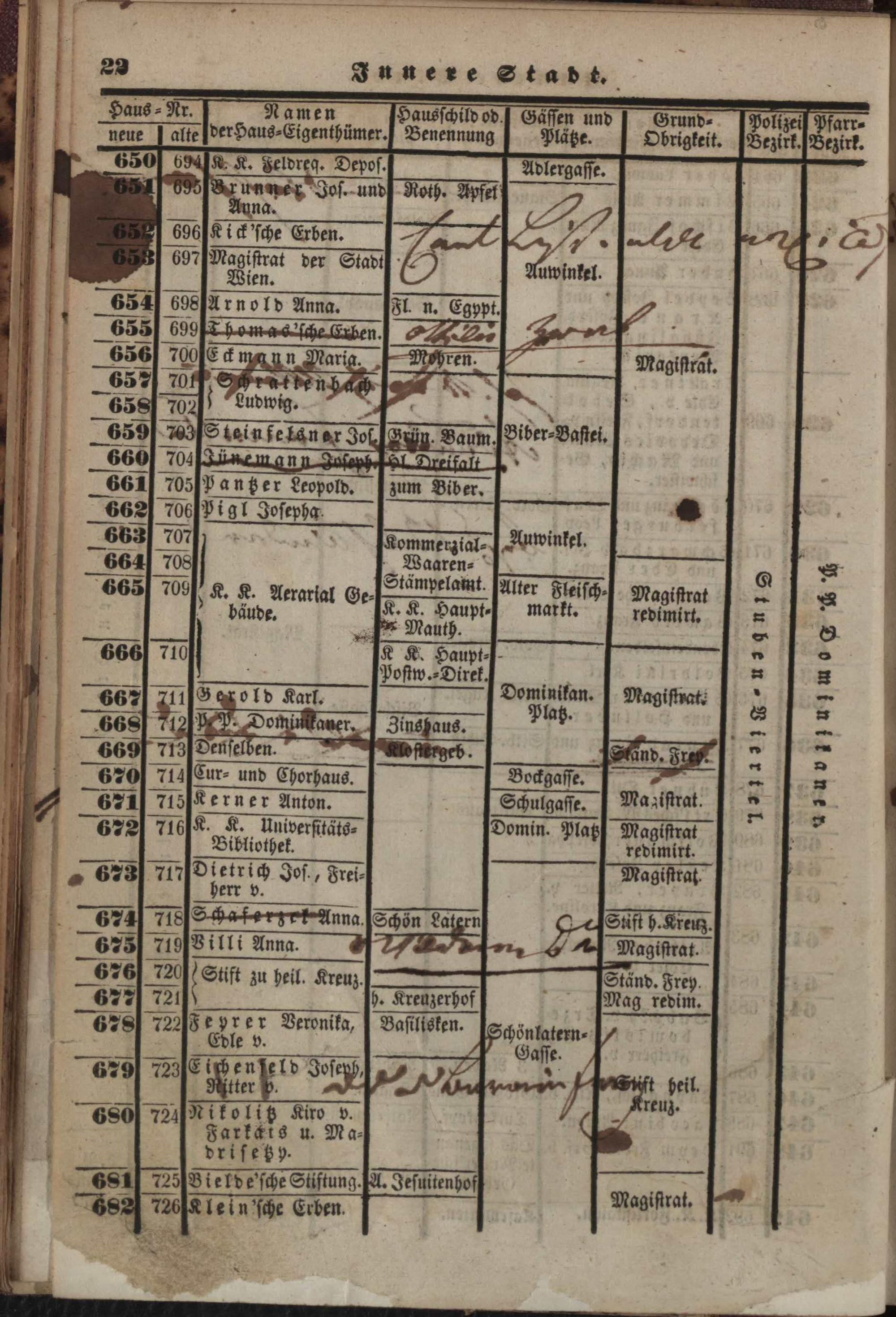 Neuer, verbesserter Häuser-Schema der k. k. Haupt- und Residenzstadt Wien mit ihren 34 Vorstädten, allen Neubauten und den angränzenden nahen Ortschaften, welche noch zu den Polizei-Bezirken Wiens gehören, als: Währing, Herrnals, Neulerchenfeld, Fünf- und Sechshaus, Rustendorf, Braunhirschengrund, Reindorf und Gaudenzdorf : mit genauer Angabe der Haus-Nummern, der Haus-Eigenthümer, Hausschilder, Gässen, Plätze, Grundobrigkeiten, Polizei- und Pfarr-Bezirken, so wie einem alphabetischen Namens-Verzeichnisse sämmtlicher Haus-Eigenthümer ; mit einem neuen Plane der Stadt und sämmtlichen Vorstädten mit den Haus-Nummern / nach den neuesten und zuverläßigsten Quellen bearb. und hrsg. von Carl Schwab