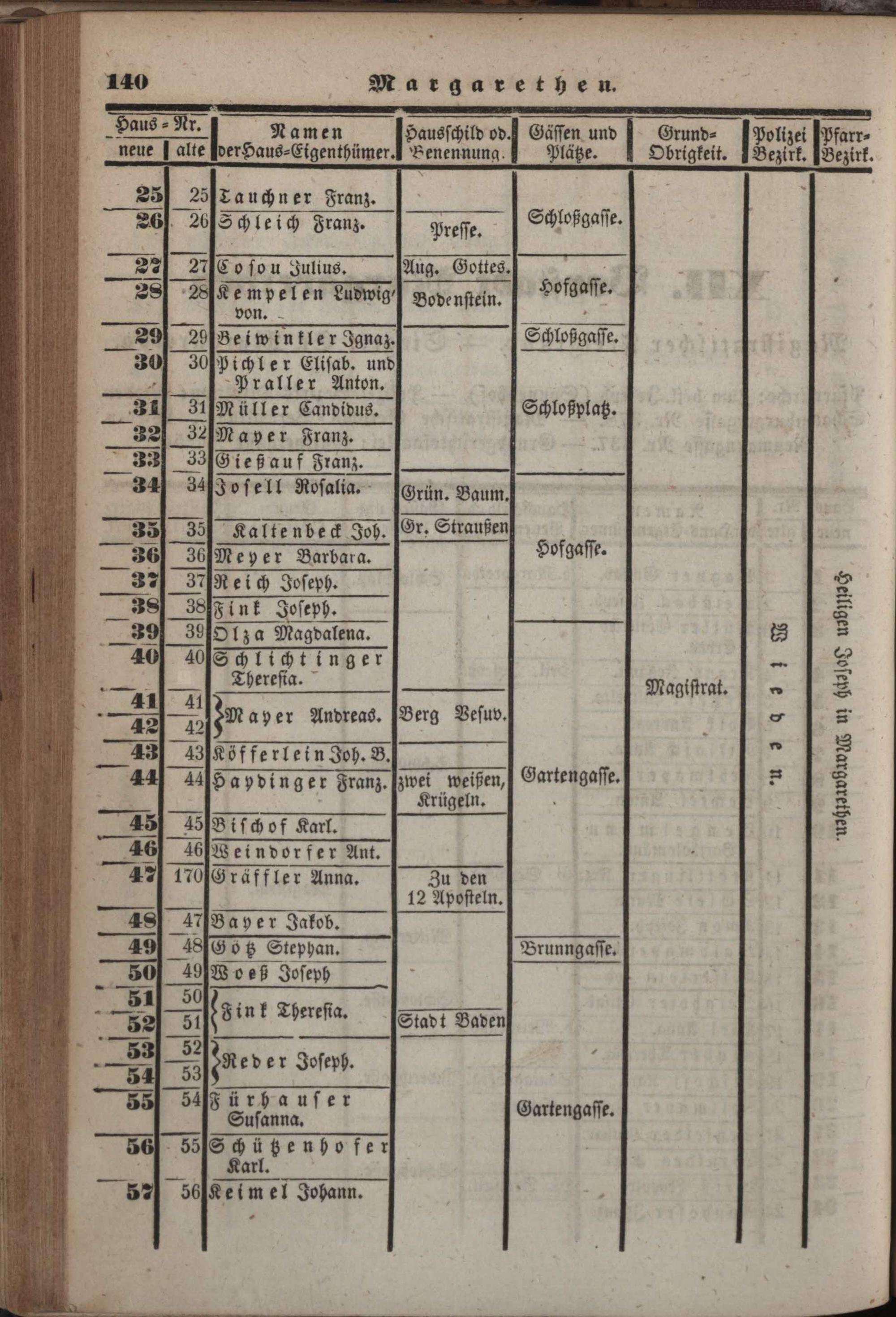 Neuer, verbesserter Häuser-Schema der k. k. Haupt- und Residenzstadt Wien mit ihren 34 Vorstädten, allen Neubauten und den angränzenden nahen Ortschaften, welche noch zu den Polizei-Bezirken Wiens gehören, als: Währing, Herrnals, Neulerchenfeld, Fünf- und Sechshaus, Rustendorf, Braunhirschengrund, Reindorf und Gaudenzdorf : mit genauer Angabe der Haus-Nummern, der Haus-Eigenthümer, Hausschilder, Gässen, Plätze, Grundobrigkeiten, Polizei- und Pfarr-Bezirken, so wie einem alphabetischen Namens-Verzeichnisse sämmtlicher Haus-Eigenthümer ; mit einem neuen Plane der Stadt und sämmtlichen Vorstädten mit den Haus-Nummern / nach den neuesten und zuverläßigsten Quellen bearb. und hrsg. von Carl Schwab