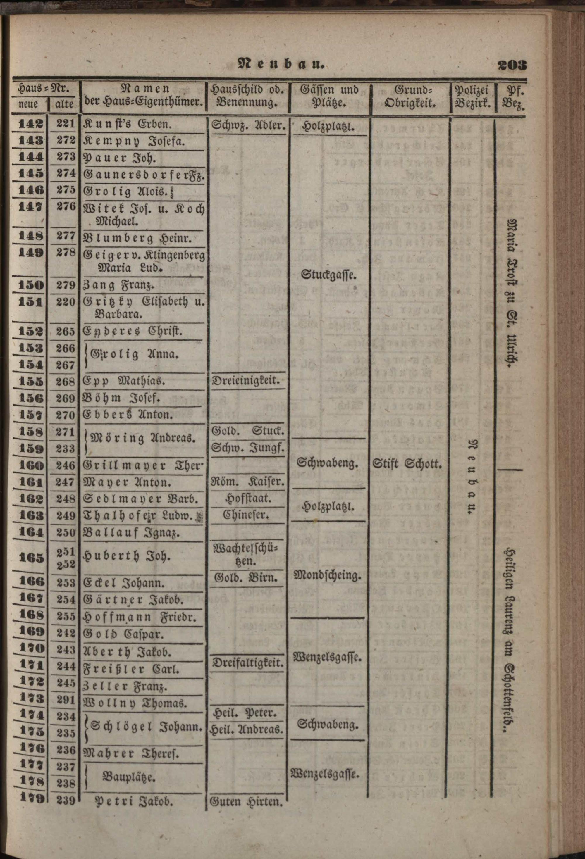 Neuer, verbesserter Häuser-Schema der k. k. Haupt- und Residenzstadt Wien mit ihren 34 Vorstädten, allen Neubauten und den angränzenden nahen Ortschaften, welche noch zu den Polizei-Bezirken Wiens gehören, als: Währing, Herrnals, Neulerchenfeld, Fünf- und Sechshaus, Rustendorf, Braunhirschengrund, Reindorf und Gaudenzdorf : mit genauer Angabe der Haus-Nummern, der Haus-Eigenthümer, Hausschilder, Gässen, Plätze, Grundobrigkeiten, Polizei- und Pfarr-Bezirken, so wie einem alphabetischen Namens-Verzeichnisse sämmtlicher Haus-Eigenthümer ; mit einem neuen Plane der Stadt und sämmtlichen Vorstädten mit den Haus-Nummern / nach den neuesten und zuverläßigsten Quellen bearb. und hrsg. von Carl Schwab