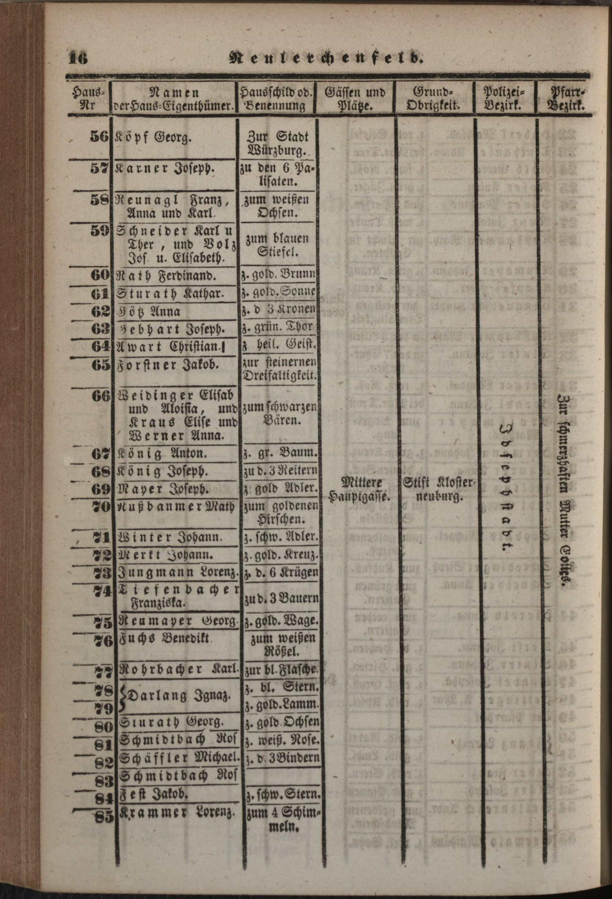 Neuer, verbesserter Häuser-Schema der k. k. Haupt- und Residenzstadt Wien mit ihren 34 Vorstädten, allen Neubauten und den angränzenden nahen Ortschaften, welche noch zu den Polizei-Bezirken Wiens gehören, als: Währing, Herrnals, Neulerchenfeld, Fünf- und Sechshaus, Rustendorf, Braunhirschengrund, Reindorf und Gaudenzdorf : mit genauer Angabe der Haus-Nummern, der Haus-Eigenthümer, Hausschilder, Gässen, Plätze, Grundobrigkeiten, Polizei- und Pfarr-Bezirken, so wie einem alphabetischen Namens-Verzeichnisse sämmtlicher Haus-Eigenthümer ; mit einem neuen Plane der Stadt und sämmtlichen Vorstädten mit den Haus-Nummern / nach den neuesten und zuverläßigsten Quellen bearb. und hrsg. von Carl Schwab