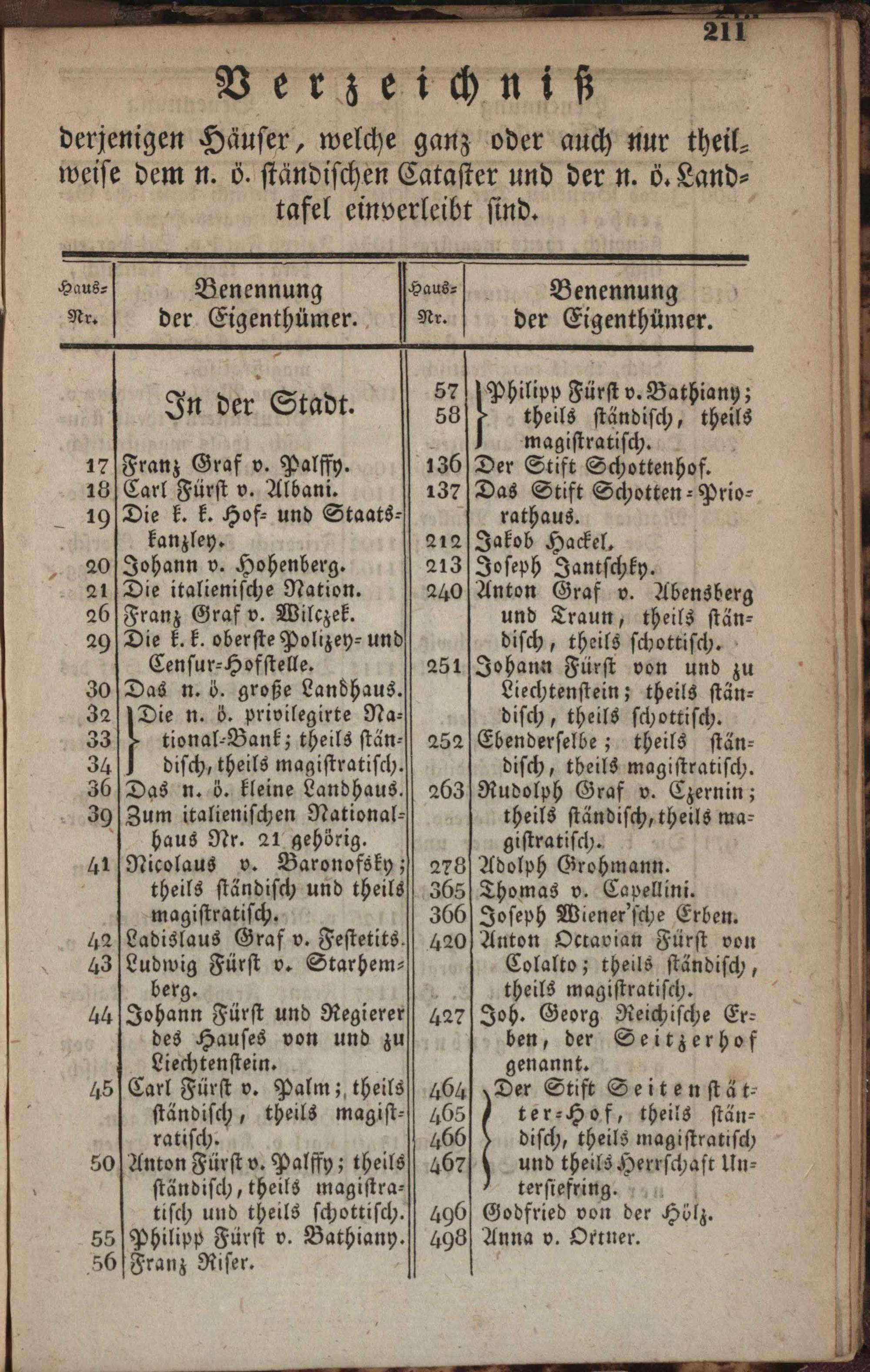 Darstellung der bei den Häusern in der Stadt und in den sämmtlichen Vorstädten Wiens einschreitenden Grundherrlichkeiten : nebst besonderen Verzeichnissen über die sowohl ganz, als auch nur theilweise dem n. ö. ständischen Cataster und der n. ö. Landtafel einverleibten, dann der Fideicommiß-Häuser und der bei der inneren Stadt und bei jedem einzelnen Vorstadtgrunde bestehenden Grundherrschaften / von Karl Ponschab