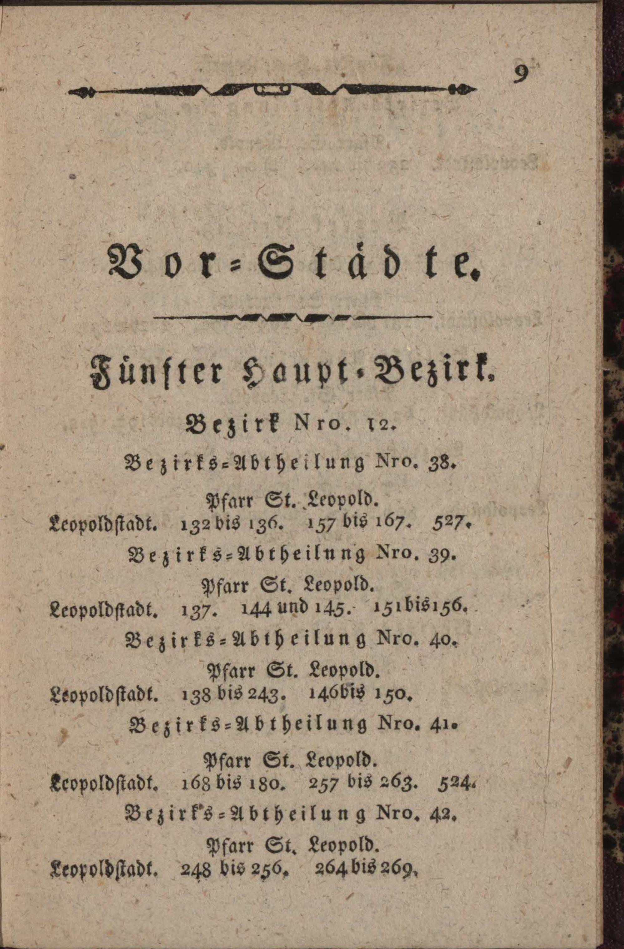 Eintheilung der Stadt und Vorstädte Wiens mit Inbegriff der Pfarren Neulerchenfeld und Reindorf : zum Behufe der allgemeinen Armen-Untersuchung ; woraus zu ersehen, zu welcher Pfarre jede Bezirks-Abtheilung gehört, welche Hausnummern in jeder liegen, welche Bezirks-Abtheilungen einen Bezirk, und welche Bezirke einen Haupt-Bezirk ausmachen