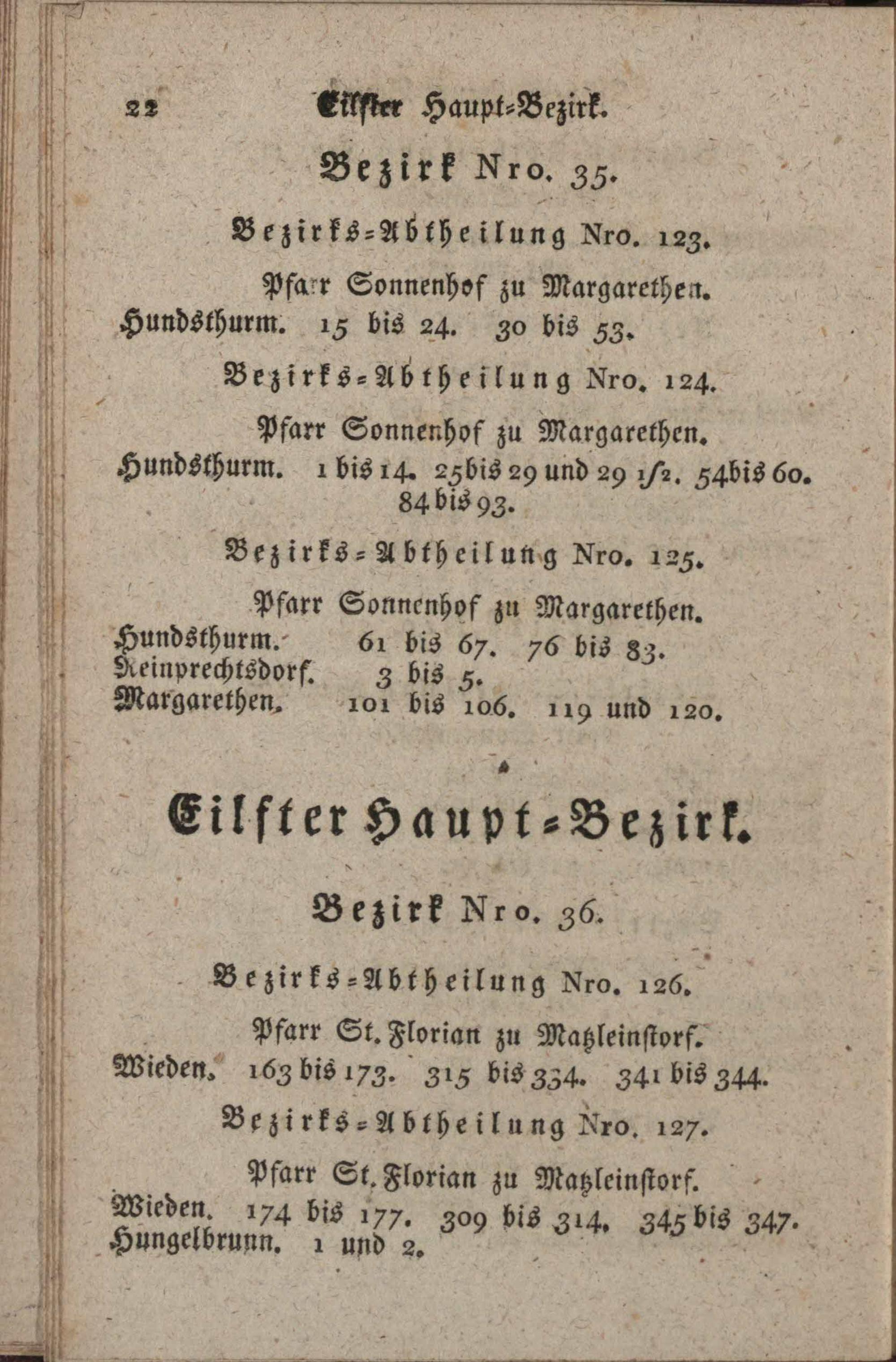 Eintheilung der Stadt und Vorstädte Wiens mit Inbegriff der Pfarren Neulerchenfeld und Reindorf : zum Behufe der allgemeinen Armen-Untersuchung ; woraus zu ersehen, zu welcher Pfarre jede Bezirks-Abtheilung gehört, welche Hausnummern in jeder liegen, welche Bezirks-Abtheilungen einen Bezirk, und welche Bezirke einen Haupt-Bezirk ausmachen
