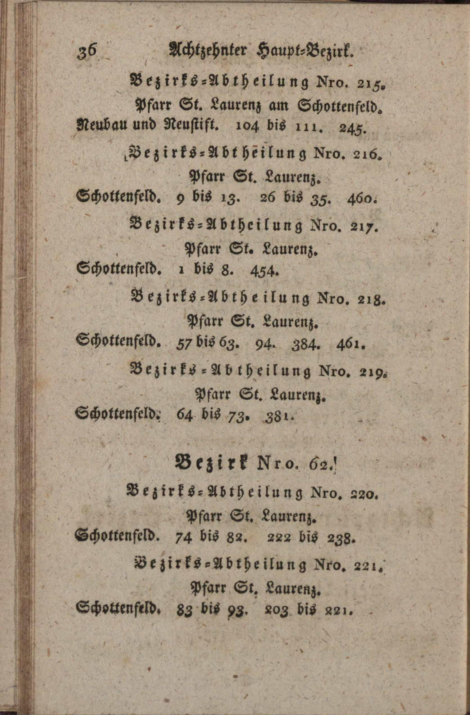 Eintheilung der Stadt und Vorstädte Wiens mit Inbegriff der Pfarren Neulerchenfeld und Reindorf : zum Behufe der allgemeinen Armen-Untersuchung ; woraus zu ersehen, zu welcher Pfarre jede Bezirks-Abtheilung gehört, welche Hausnummern in jeder liegen, welche Bezirks-Abtheilungen einen Bezirk, und welche Bezirke einen Haupt-Bezirk ausmachen