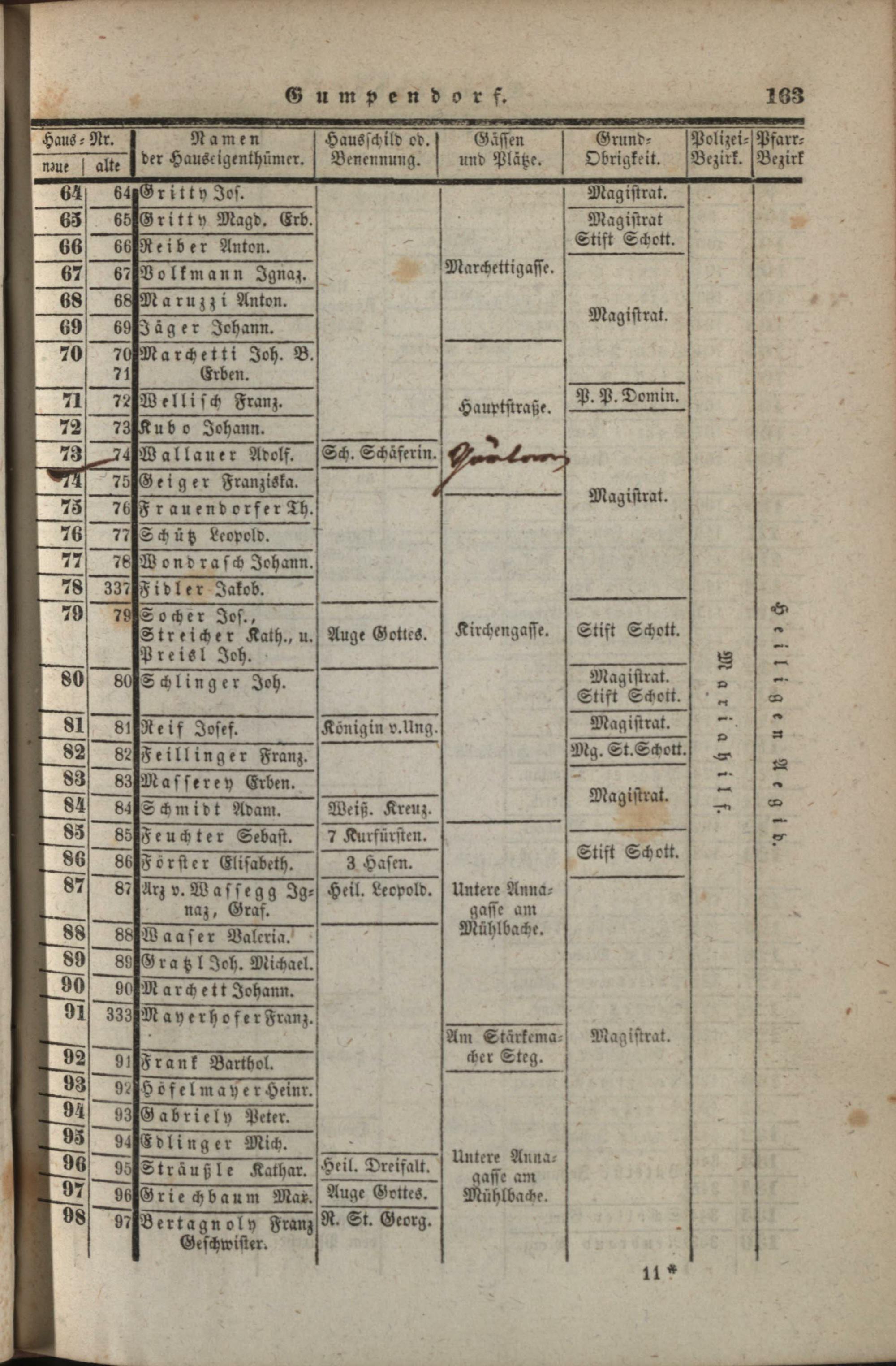 Neues, verbessertes und vermehrtes Häuser-Schema der k. k. Haupt- und Residenzstadt Wien : mit ihren 34 Vorstädten, allen Neubauten und den angränzenden nahen Ortschaften, welche noch zu den Polizei-Bezirken Wiens gehören, als: Brigittenau, Währing, Hernals, Neulerchenfeld, Fünf- und Sechshaus, Rustendorf, Braunhirschen, Reindorf, dann Gaudenzdorf ; mit genauer Angabe der Haus-Nummern...