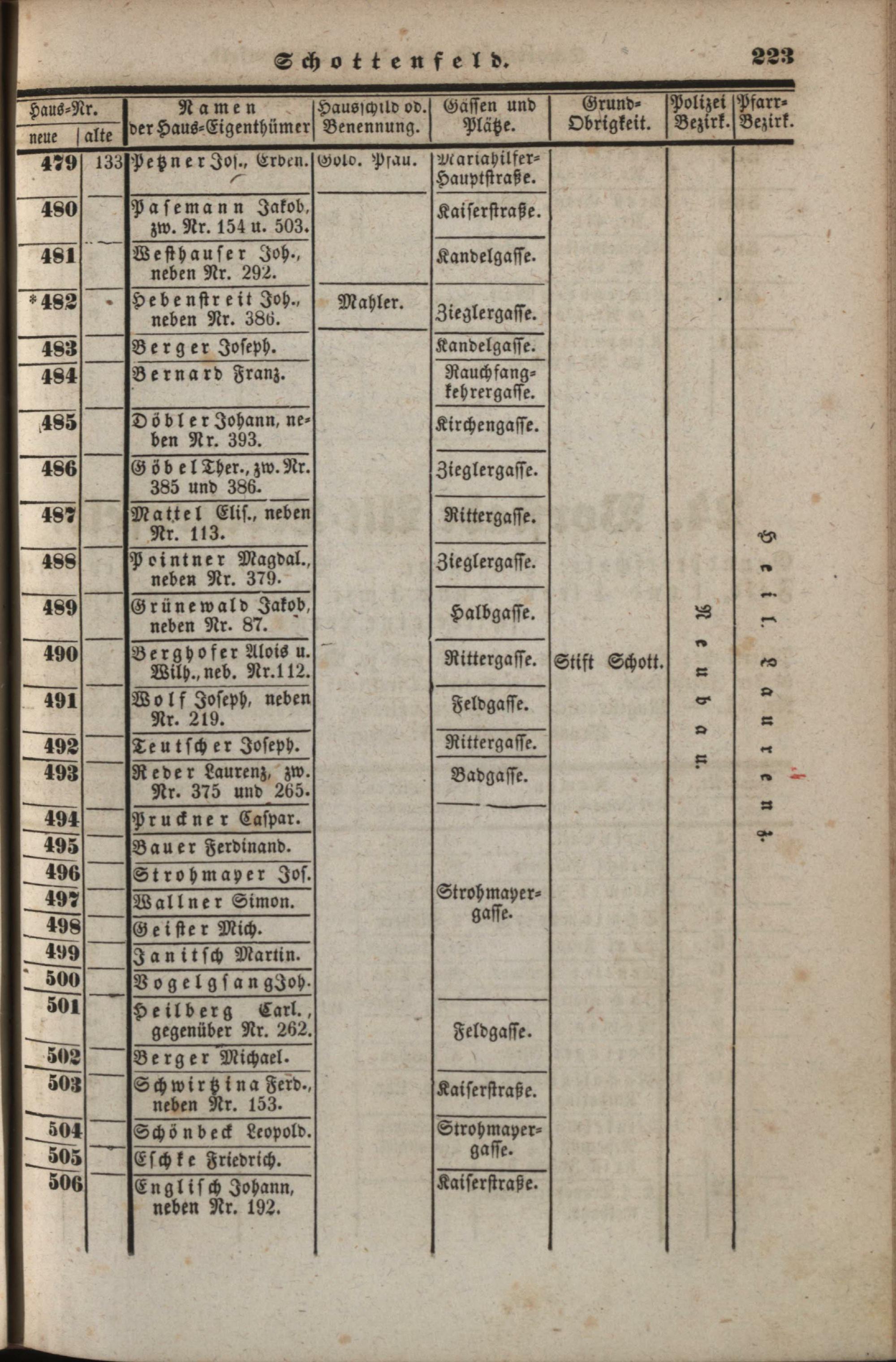 Neues, verbessertes und vermehrtes Häuser-Schema der k. k. Haupt- und Residenzstadt Wien : mit ihren 34 Vorstädten, allen Neubauten und den angränzenden nahen Ortschaften, welche noch zu den Polizei-Bezirken Wiens gehören, als: Brigittenau, Währing, Hernals, Neulerchenfeld, Fünf- und Sechshaus, Rustendorf, Braunhirschen, Reindorf, dann Gaudenzdorf ; mit genauer Angabe der Haus-Nummern...