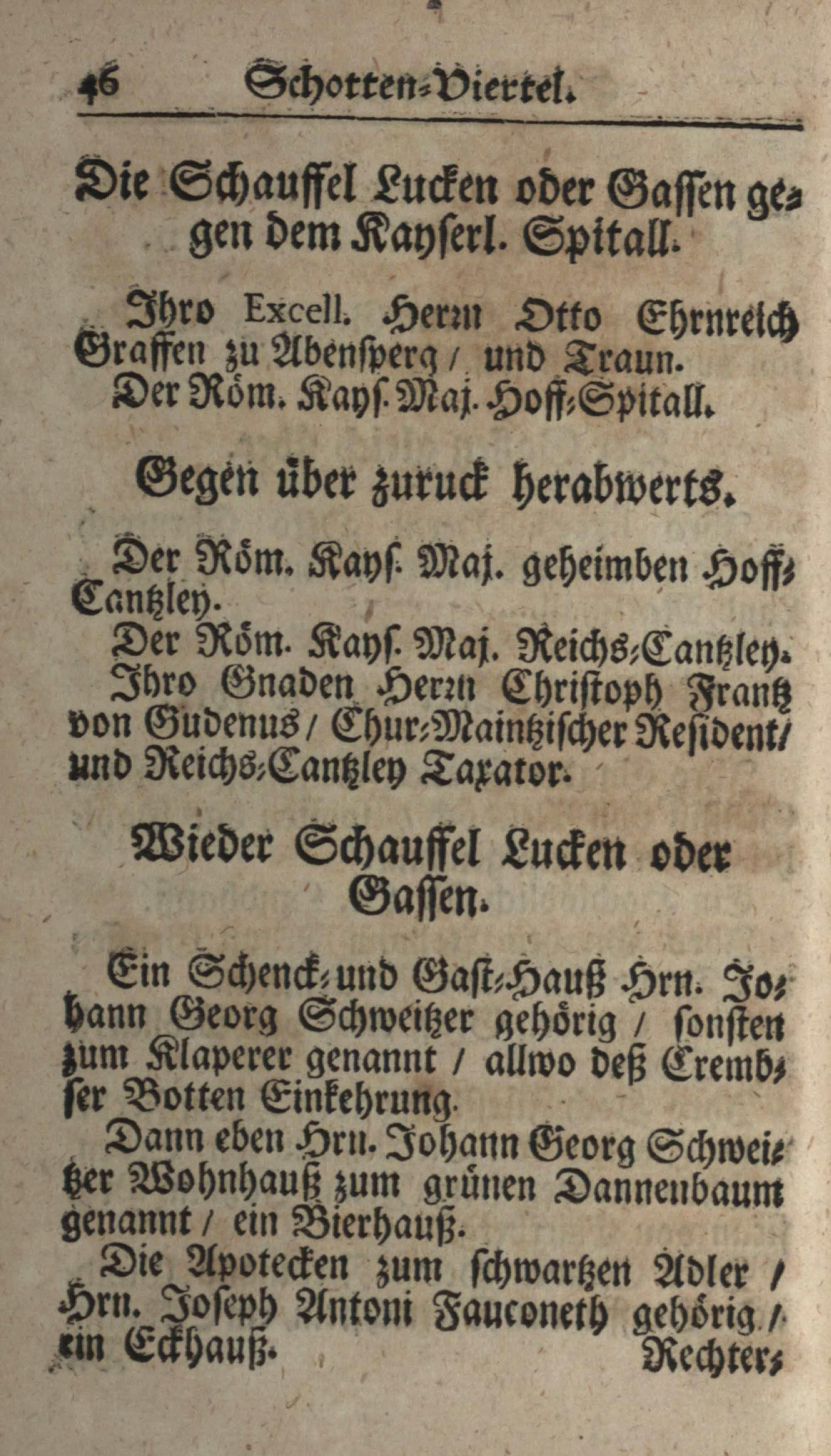 Schatz, Schutz und Schantz deß Ertz-Hertzogtumbs Oesterreich : das ist ein sehr genaue und ordentliche Beschreibung aller Gassen, Plätz, Palläst, Häuser und Kirchen der berühmten Haubt- und Kayserl. Residenz-Statt Wienn ; dermalen an statt eines neuen Jahres-Offert demütigist dediciert / von mir Johann Jordan