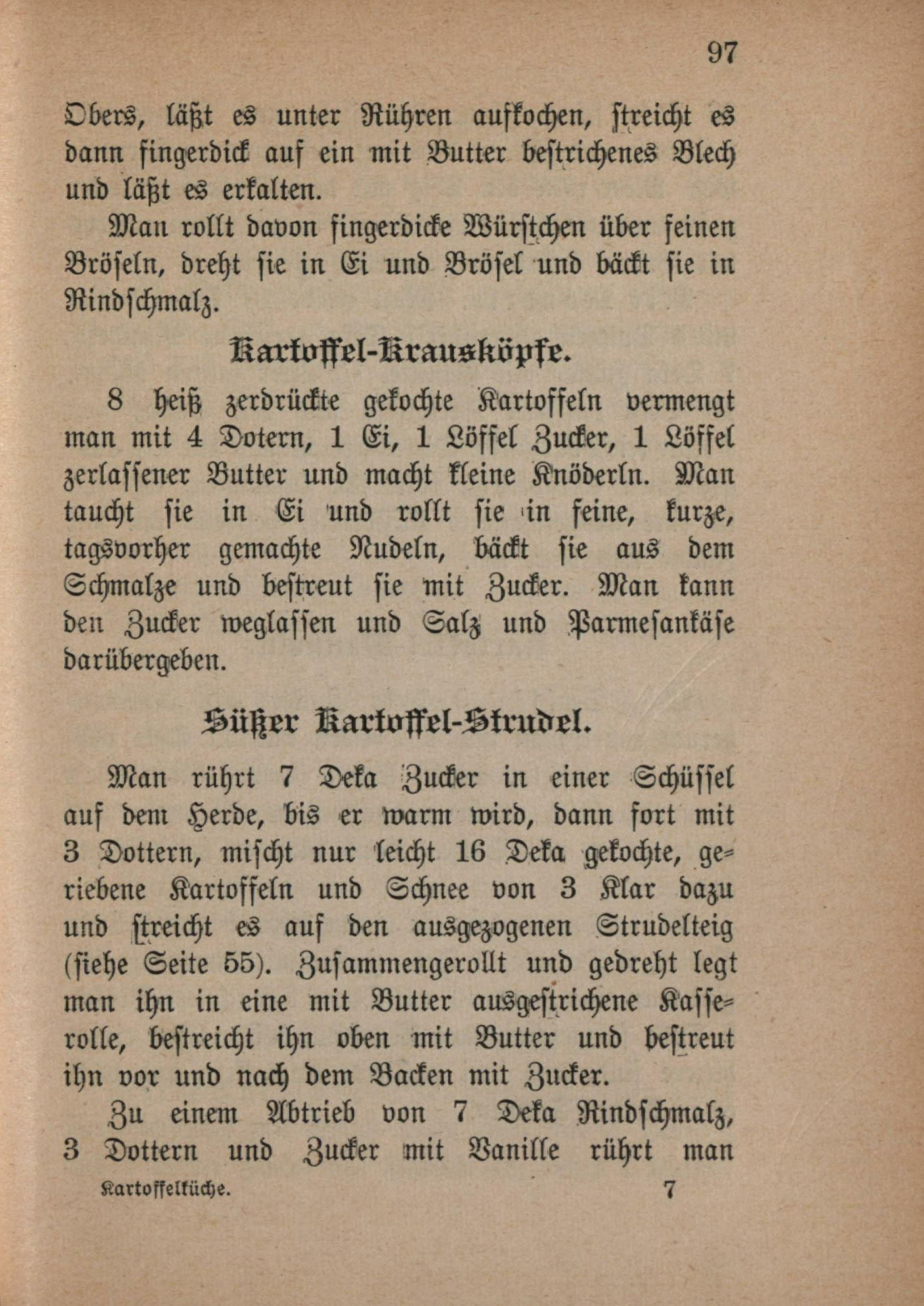 Kartoffelküche : Sammlung praktisch erprobter Rezepte für den einfachsten und feinsten Haushalt / hrsg. von Paula Kortschak. Durchgelesen von Katharina Prato
