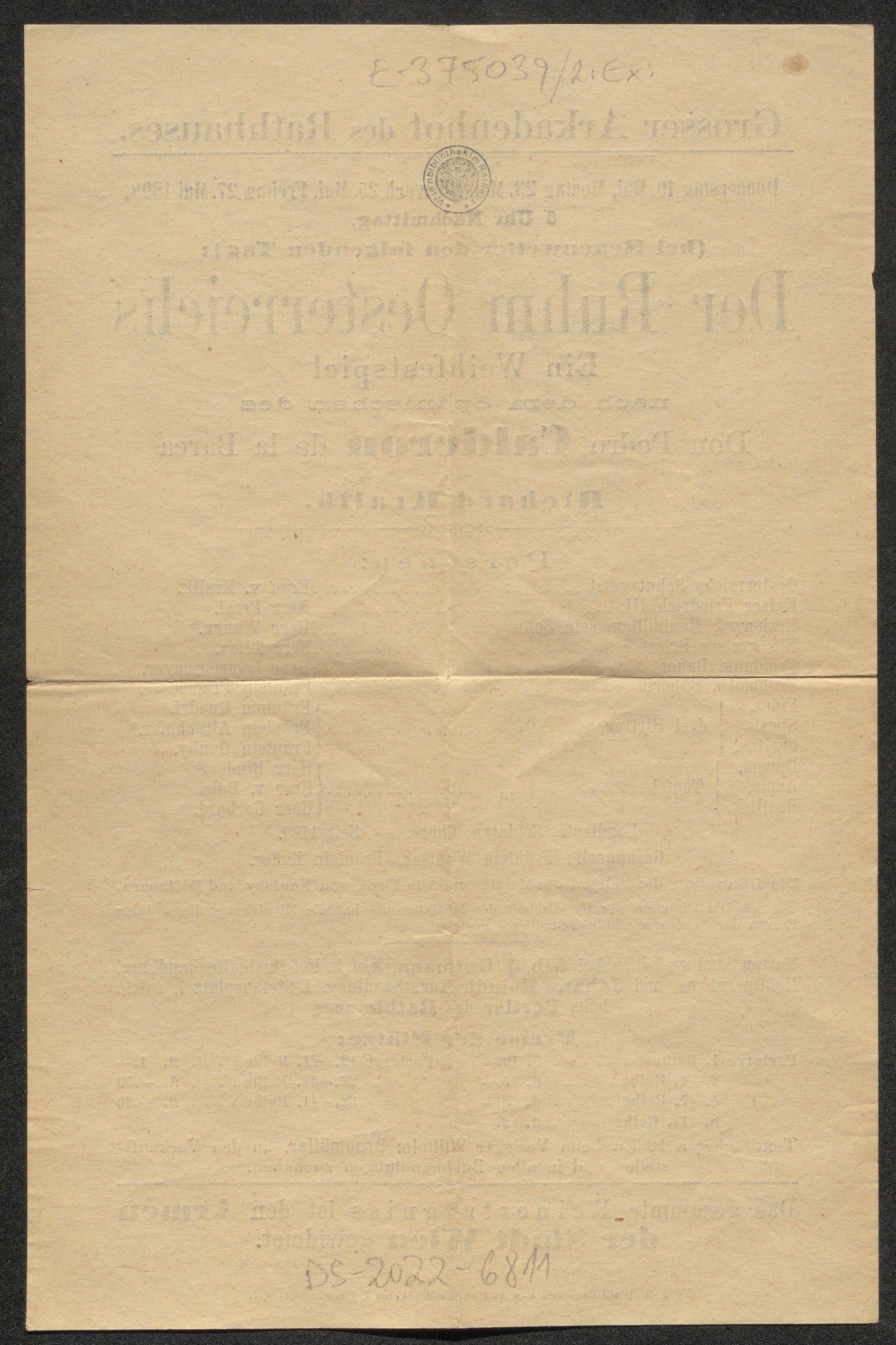 Grosser Arkadenhof des Rathhauses. Donnerstag, 19. Mai, Montag 23. Mai, Mittwoch 25. Mai, Freitag 27. Mai 1898, 5 Uhr Nachmittag, (bei Regenwetter den folgenden Tag): Der Ruhm Oesterreichs : Ein Weihfestspiel nach dem Spanischen des Don Pedro Calderon de la Barca von Richard Kralik ; Das gesammte Reinerträgniss ist den Armen der Stadt Wien gewidmet