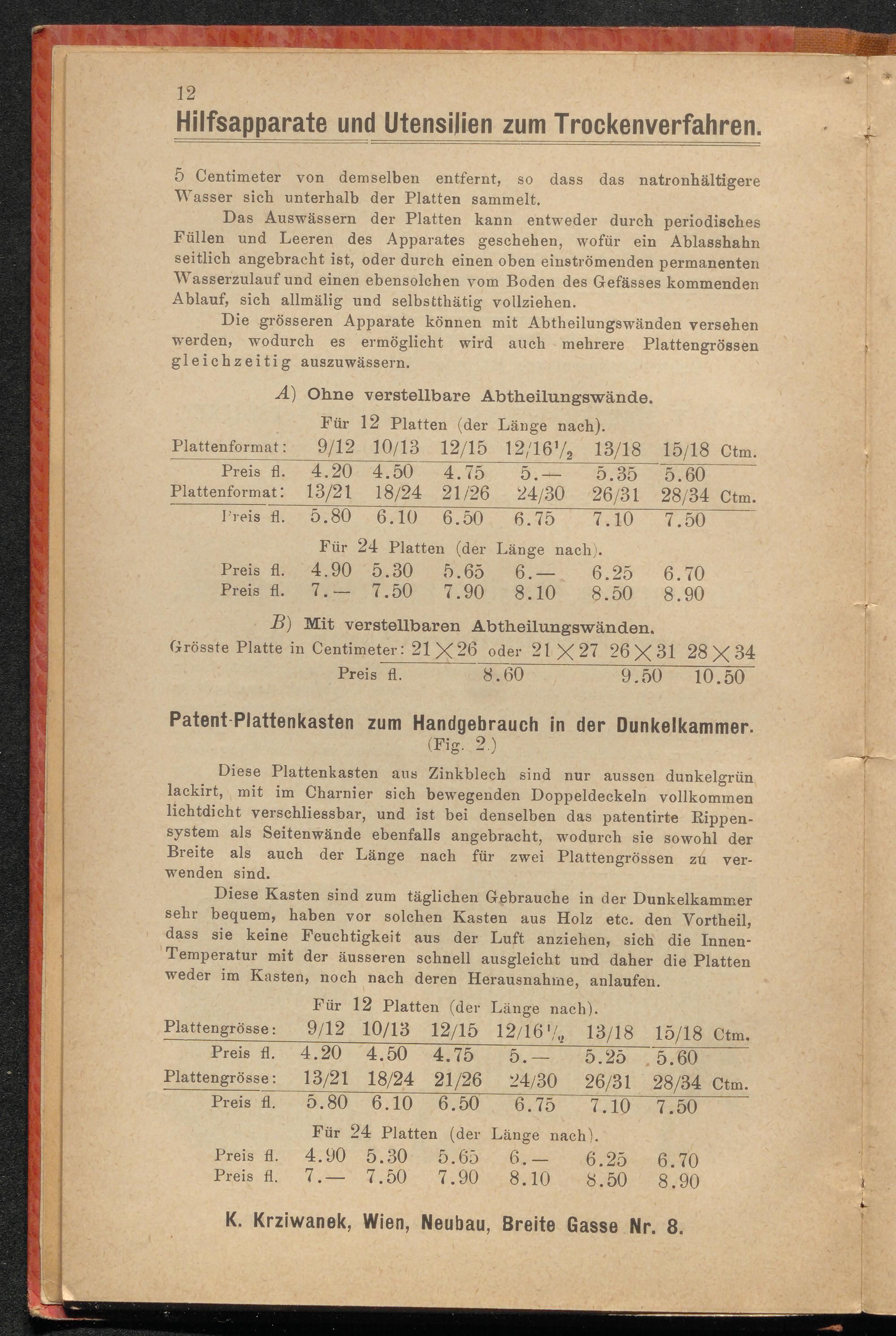 Preisliste : Fabrik und Lager sämmtlicher Bedarfs-Artikel für Phtographie, Fabrik photographischer Cartons und Lithographische Anstalt / K. Krziwanek, Wien, Neubau, Breite Gasse Nr. 8