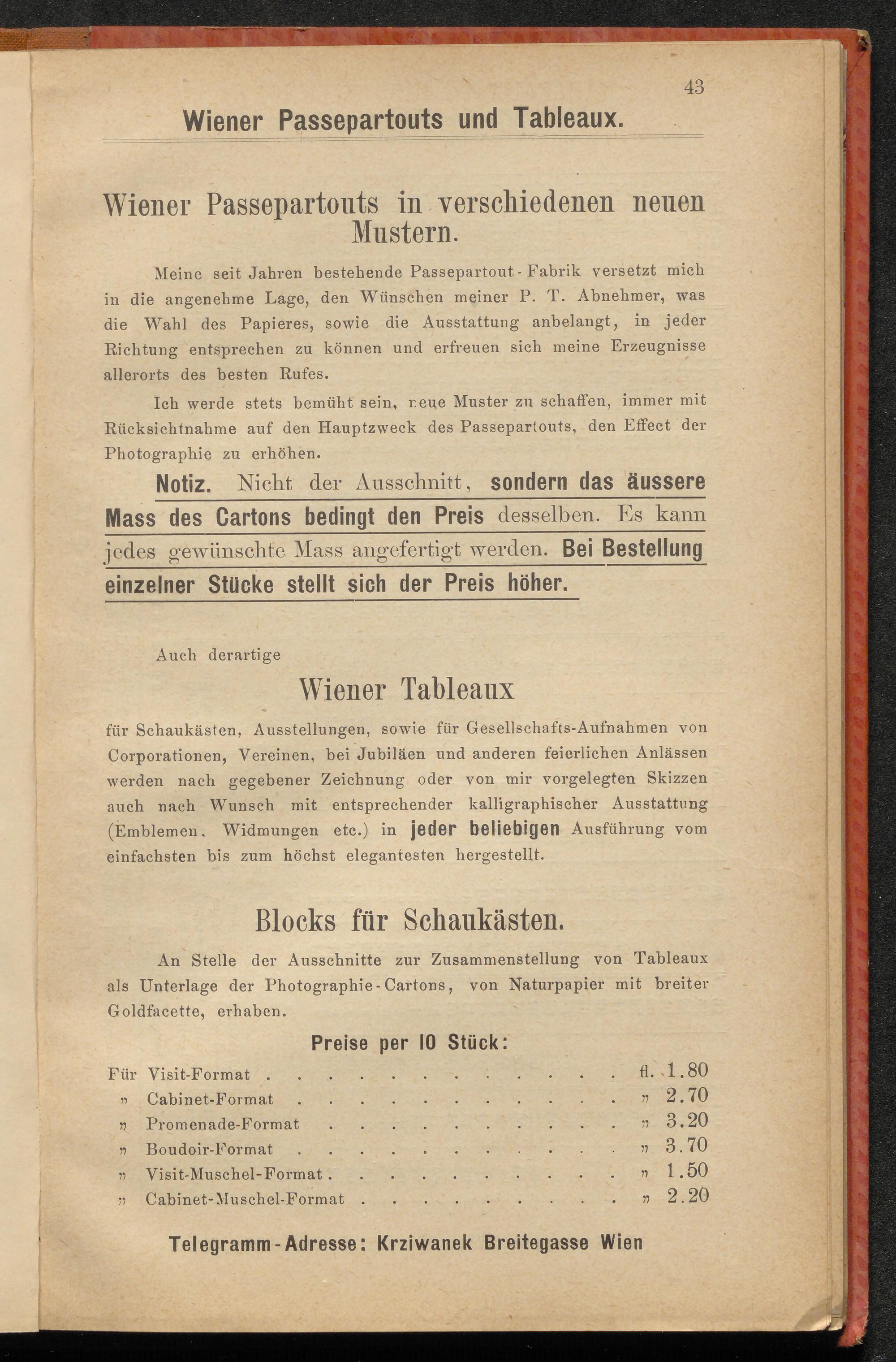Preisliste : Fabrik und Lager sämmtlicher Bedarfs-Artikel für Phtographie, Fabrik photographischer Cartons und Lithographische Anstalt / K. Krziwanek, Wien, Neubau, Breite Gasse Nr. 8