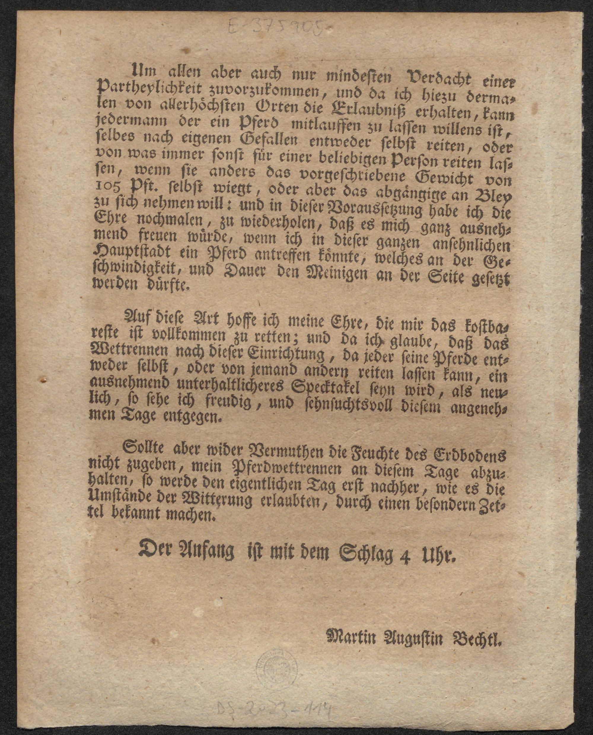 Englisches Pferdwettrennen : Ich habe mir zwar ernstlich vorgenommen, daß Pferdwettrennen auf englische Art ... / Martin Augustin Bechtl