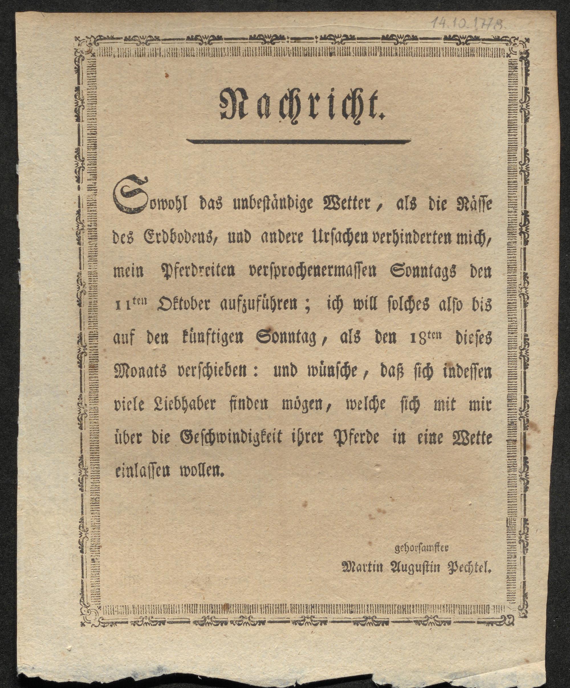 Nachricht. Sowohl das unbeständige Wetter, als die Nässe des Erdbodens, und andere Ursachen verhinderten mich, mein Pferdreiten versprochenermassen Sonntags den 11ten Oktober aufzuführen ... / gehorsamster Martin Augustin Pechtel