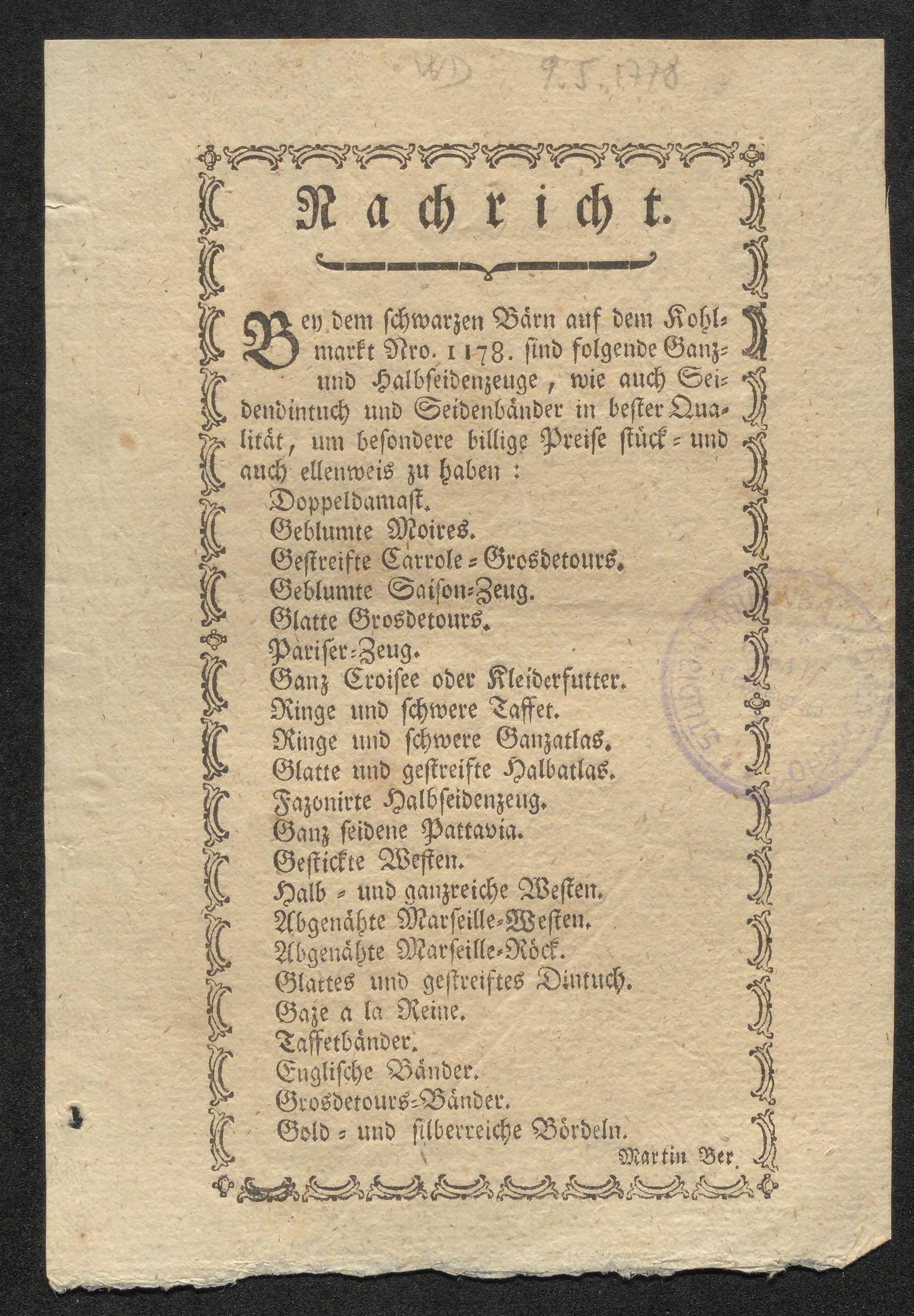 Nachricht. Bey dem schwarzen Bärn auf dem Kohlmarkt Nro. 1178 sind folgende Ganz- und Halbseidenzeuge, wie auch Seidendintuch und Seidenbänder in bester Qualität, um besondere billige Preise stück- und auch ellenweis zu haben: ... / Martin Ber