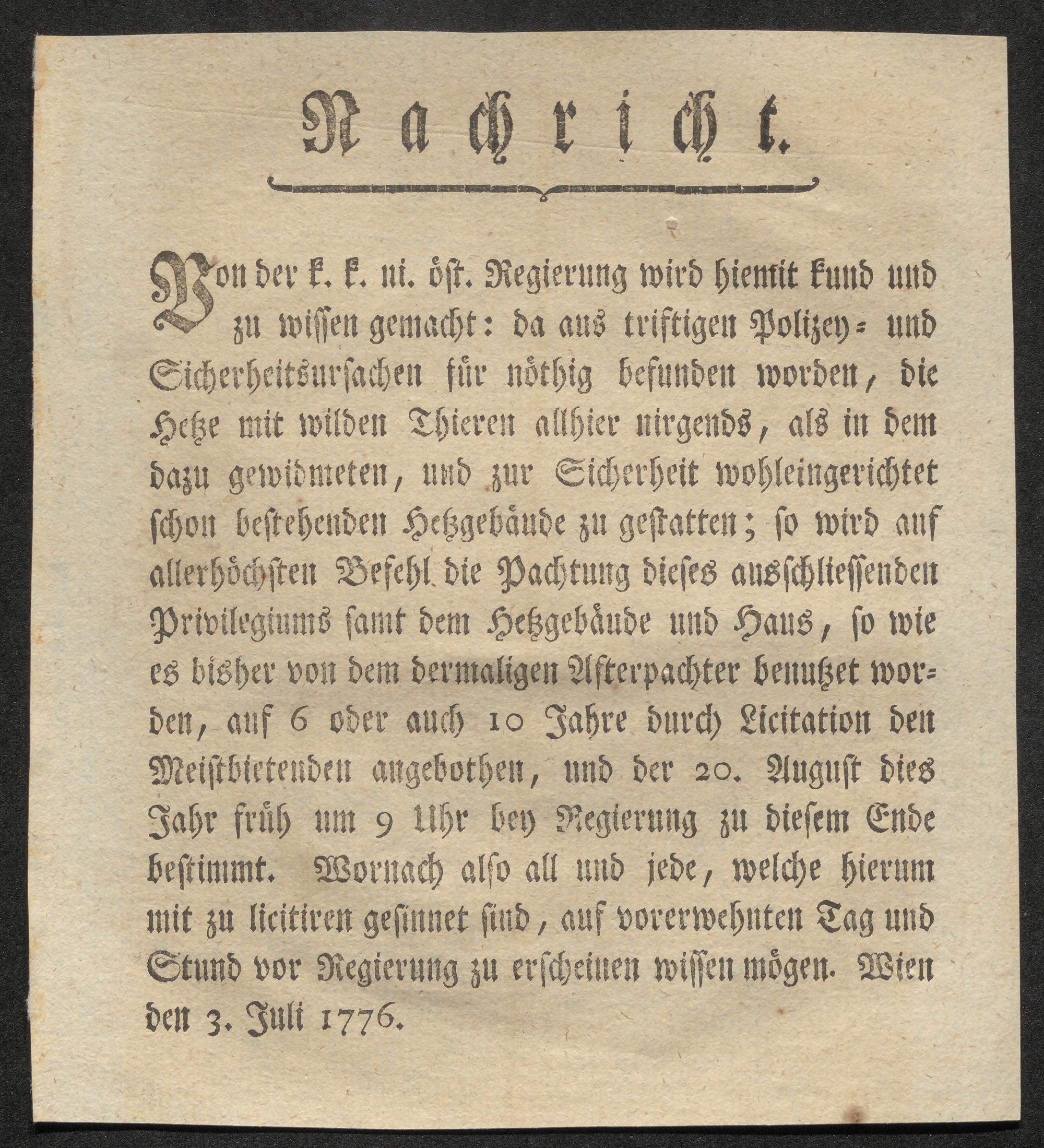 Nachricht. Von der k.k. ni. öst. Regierung wird hiemit kund und zu wissen gemacht: da aus triftigen Polizey- und Sicherheitsursachen für nöthig befunden worden, die Hetze mit wilden Thieren allhier nirgends, als in dem dazu gewidmeten, und zur Sicherheit wohleingerichtet schon bestehenden Hetzgebäude zu gestatten; so wird auf allerhöchsten Befehlt die Pachtung dieses ausschliessenden Privilegiums samt dem Hetzgebäude und Haus, so wie es bisher von dem dermaligen Afterpachter benutzet worden, auf 6 oder auch 10 Jahre durch Licitation den Meistbietenden angebothen, und der 20. August dies Jahr früh um 9 Uhr bey Regierung zu diesem Ende bestimmt : Wien den 3. Juli 1776