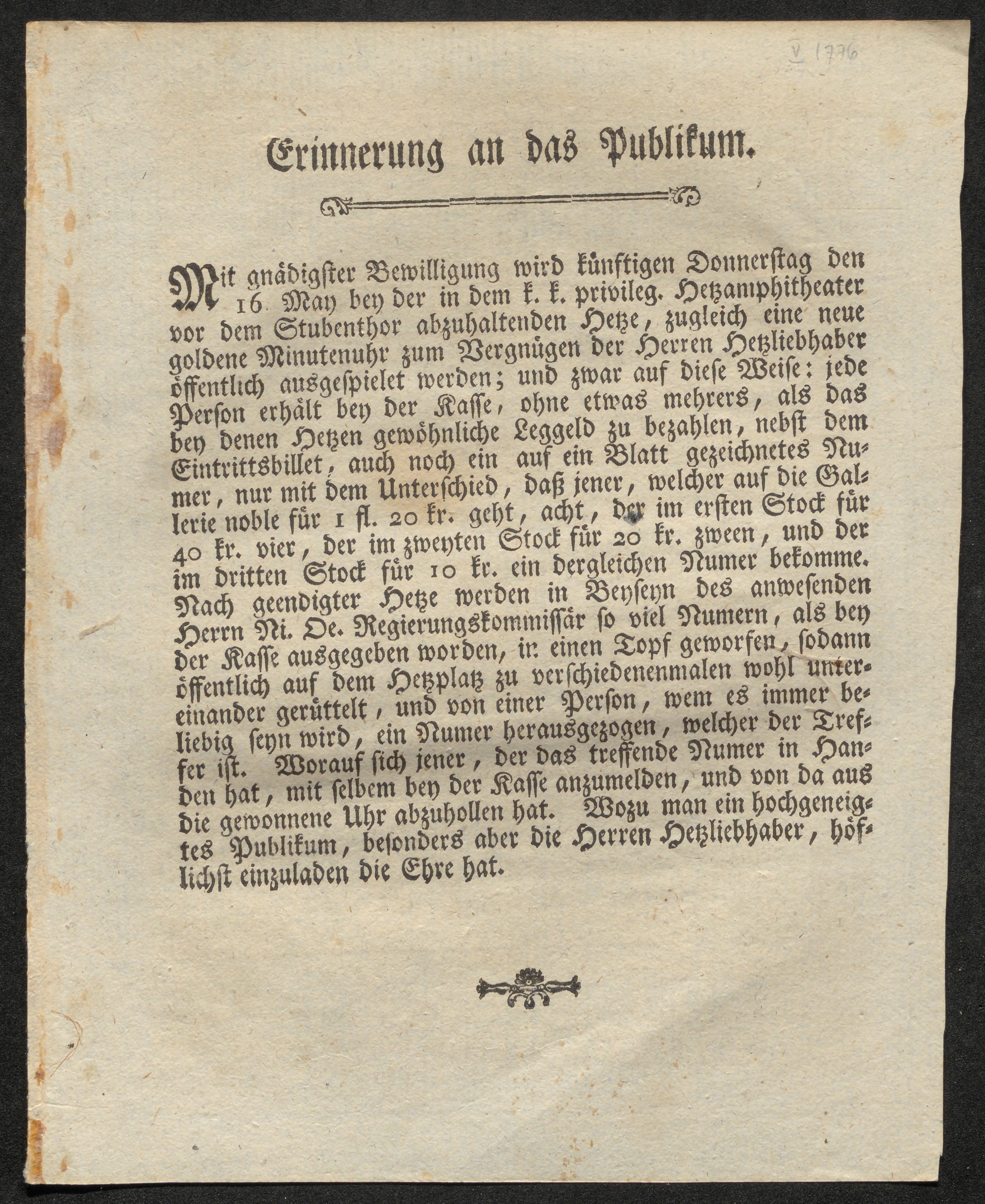 Erinnerung an das Publikum : Mit gnädigster Bewilligung wird künftigen Donnerstag den 16. May bey der in dem k.k. privileg. Hetzamphitheater vor dem Stubenthor abzuhaltenden Hetze, zugleich eine neue goldene Minutenuhr zum Vergnügen der Herren Hetzliebhaber öffentlich ausgespielet werden ...