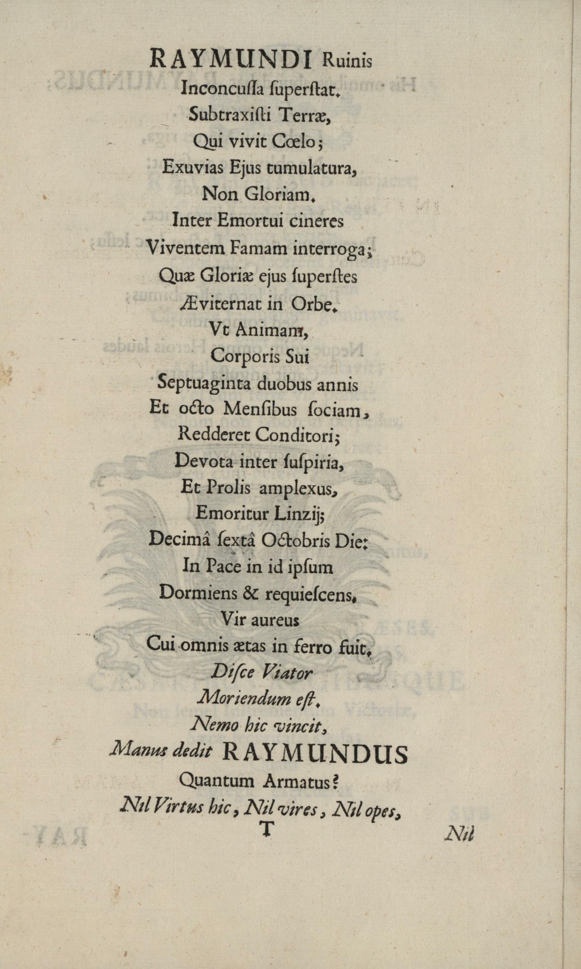 Castrum Doloris In Templo Honoris, Quod ... Ad Exempla Majorum Et Accensos Duodecim Lychnos Veluti Totidem Gradus Introijt Raymundus Montecuculorum Sidus Sive Ortus, Institutio, Vita, Res Præclare Gestæ Et Obitus ... Raymundi Principis Montecucoli ... Toparchæ In Hohenegg, Osterburgh, Gleis, & Handorff, Sacræ Cæsareæ Regiæque Majestatis Consiliarij Intimi ... / Delineata ... Authore Joanne Petro â Vaelckeren ...