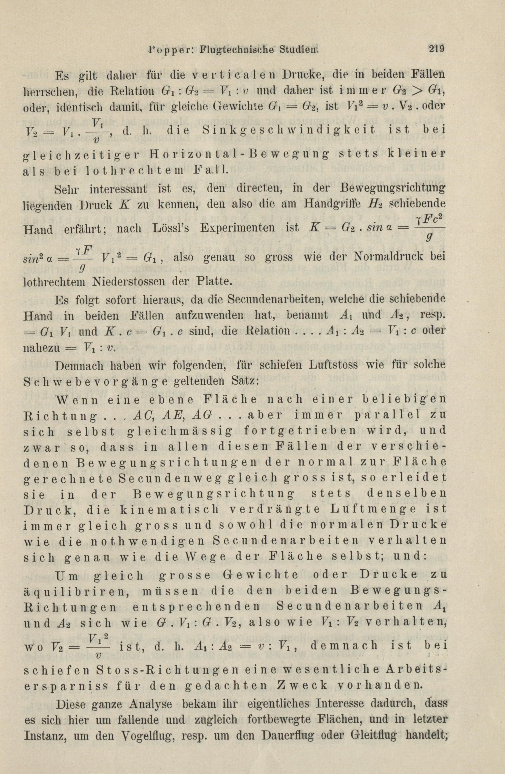 Flugtechnische Studien : I. Ueber einige flugtechnische Grundfragen; anknüpfend an eine Besprechung des Buches: "Die Luftwiderstandsgesetze, der Fall durch die Luft und der Vogelflug" von Herrn Fr. R. v. Loessl, vorgetragen am 4. Februar und 3. März 1896 im Wiener flugtechnischen Verein / von Josef Popper
