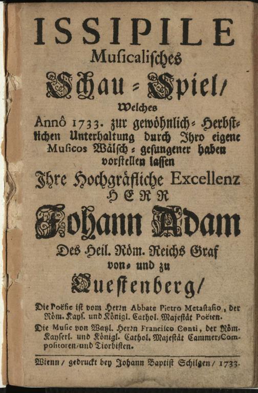 Issipile : Musicalisches Schau-Spiel, welches Anno 1733 zur gewöhnlich-Herbstlichen Unterhaltung durch Ihro eigene Musicos Wälsch-gesungener haben vorstellen lassen Ihro hochgraefliche Excellenz Herr Johann Adam Des Heil. Röm. Reichs Graf von und zu Questenberg / die Poesie ist vom ... Pietro Metastasio. Die Music von Francisco Conti