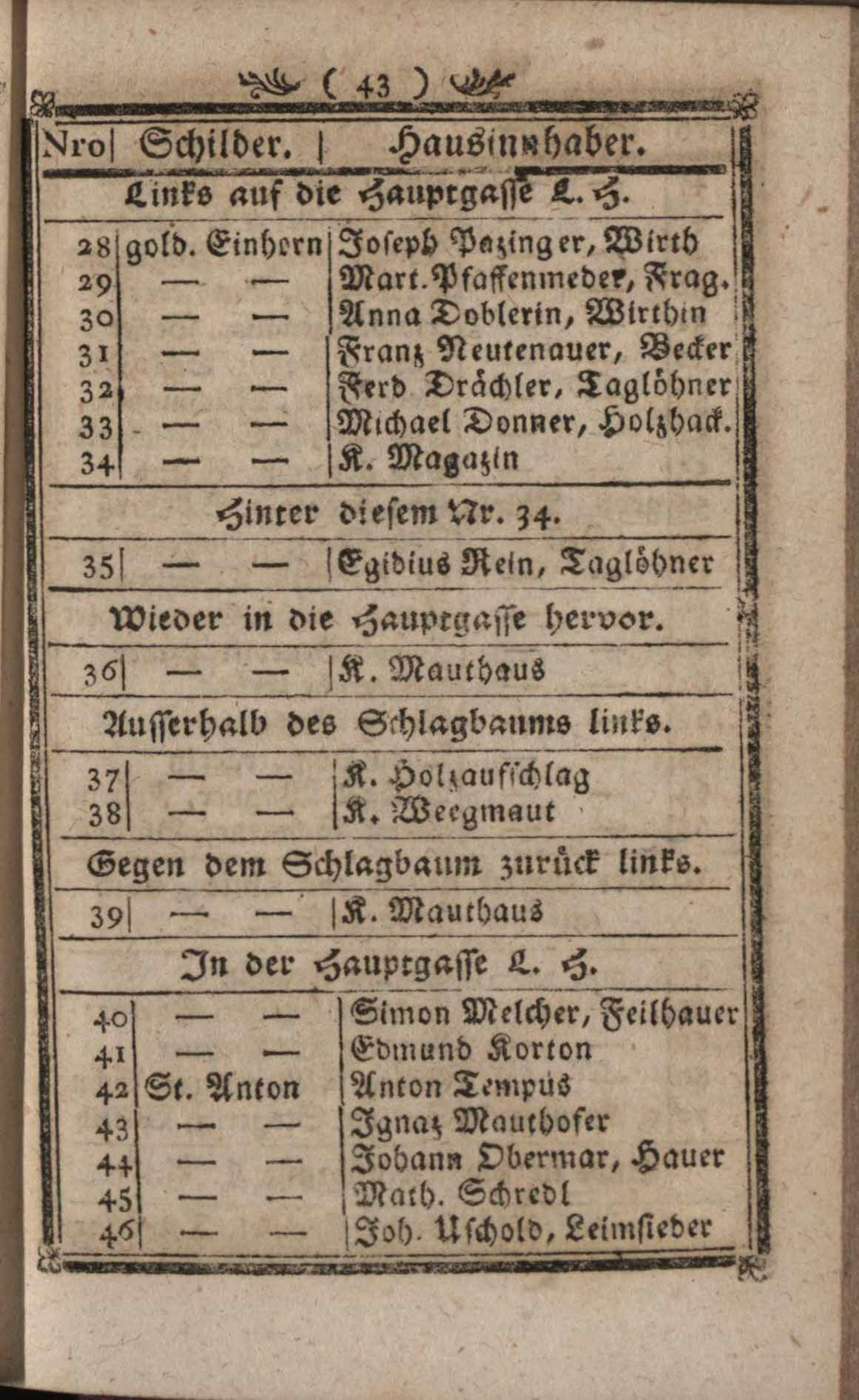 Verzeichniß der um die k. k. Haupt- und Residenzstadt Wien befindlichen Vorstädten, Gründen, Gassen, numerirten Häuser, Innhaber und ihrer Schilder