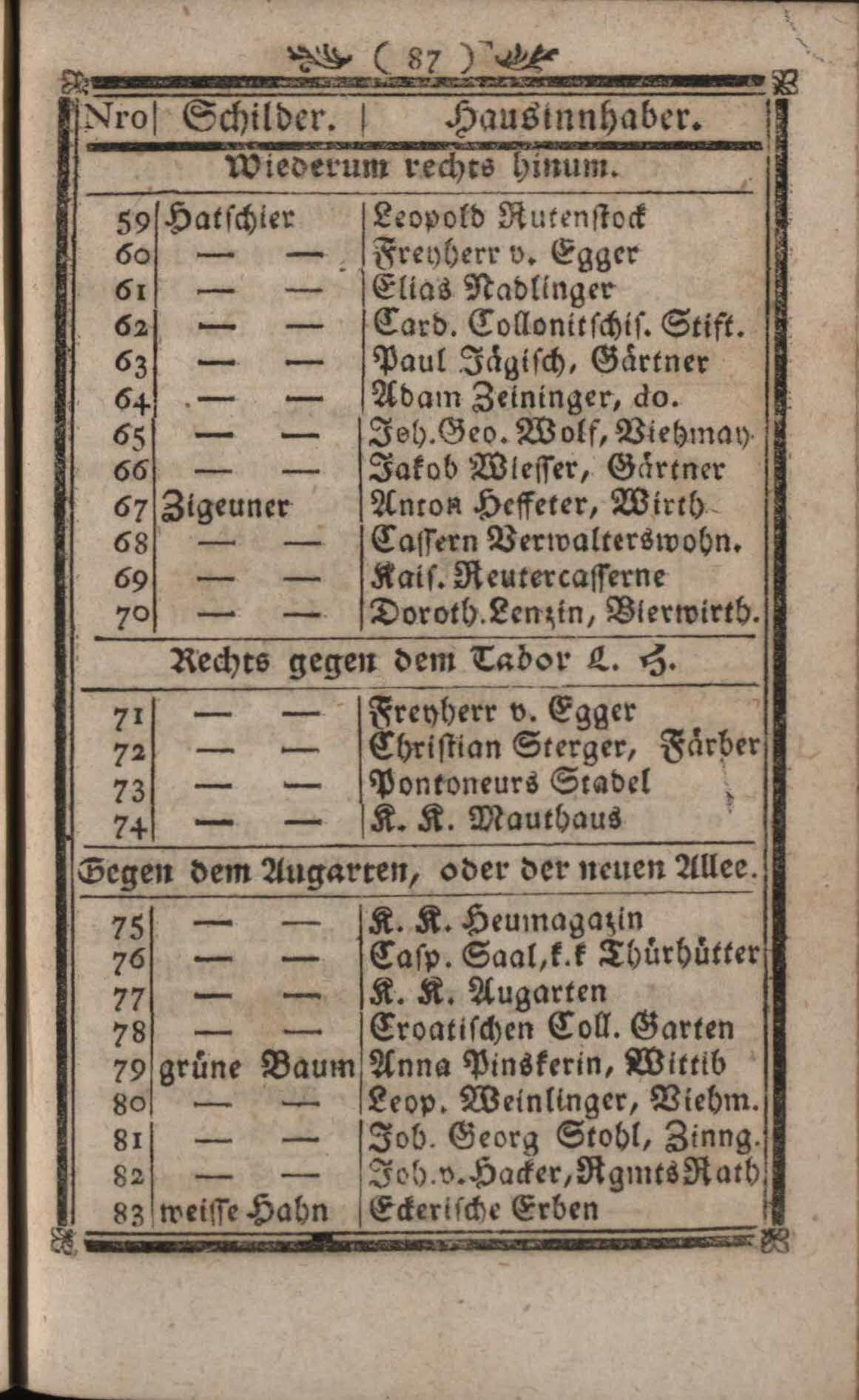 Verzeichniß der um die k. k. Haupt- und Residenzstadt Wien befindlichen Vorstädten, Gründen, Gassen, numerirten Häuser, Innhaber und ihrer Schilder