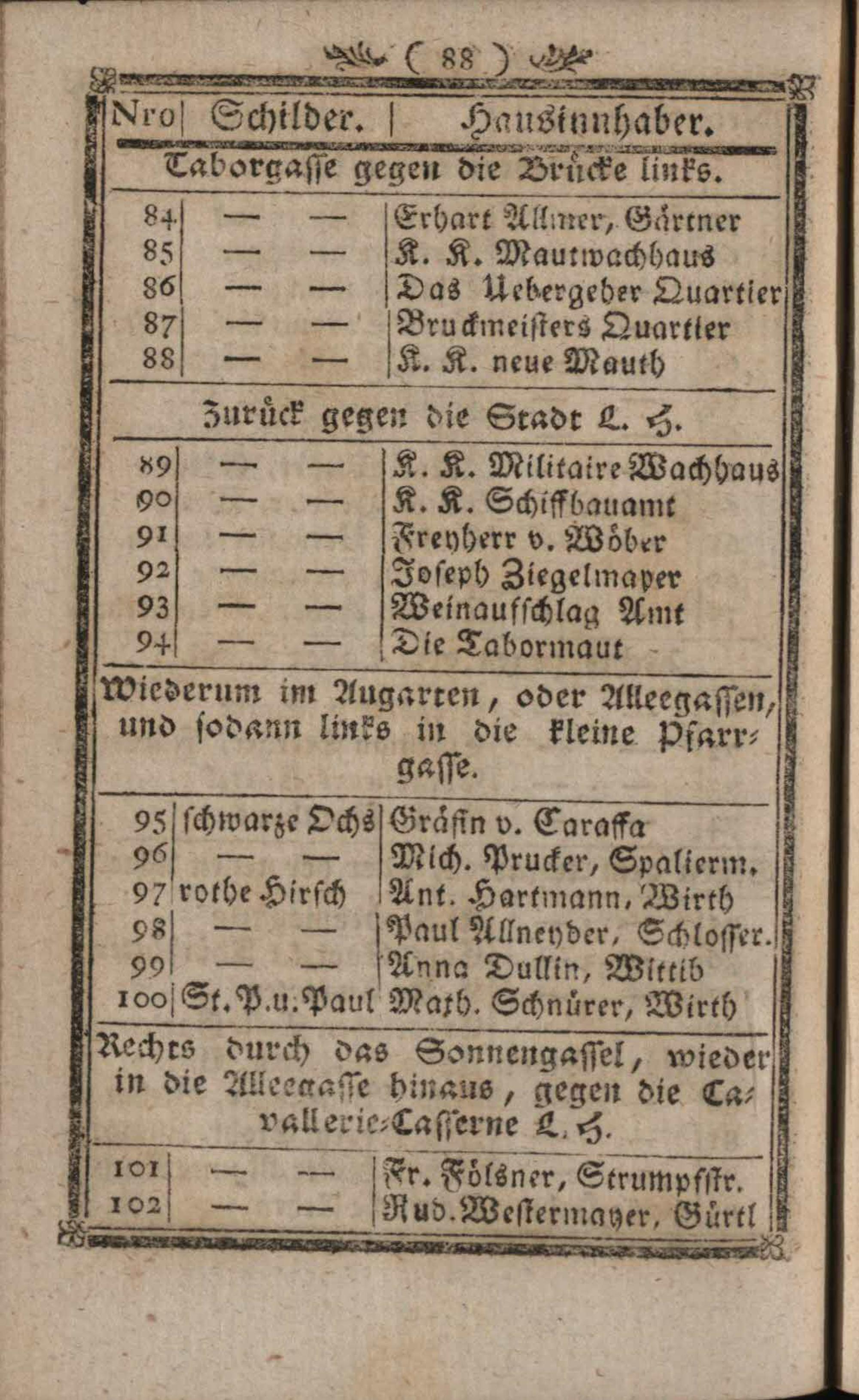 Verzeichniß der um die k. k. Haupt- und Residenzstadt Wien befindlichen Vorstädten, Gründen, Gassen, numerirten Häuser, Innhaber und ihrer Schilder