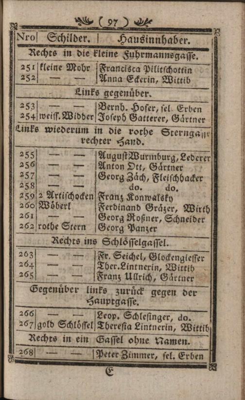 Verzeichniß der um die k. k. Haupt- und Residenzstadt Wien befindlichen Vorstädten, Gründen, Gassen, numerirten Häuser, Innhaber und ihrer Schilder