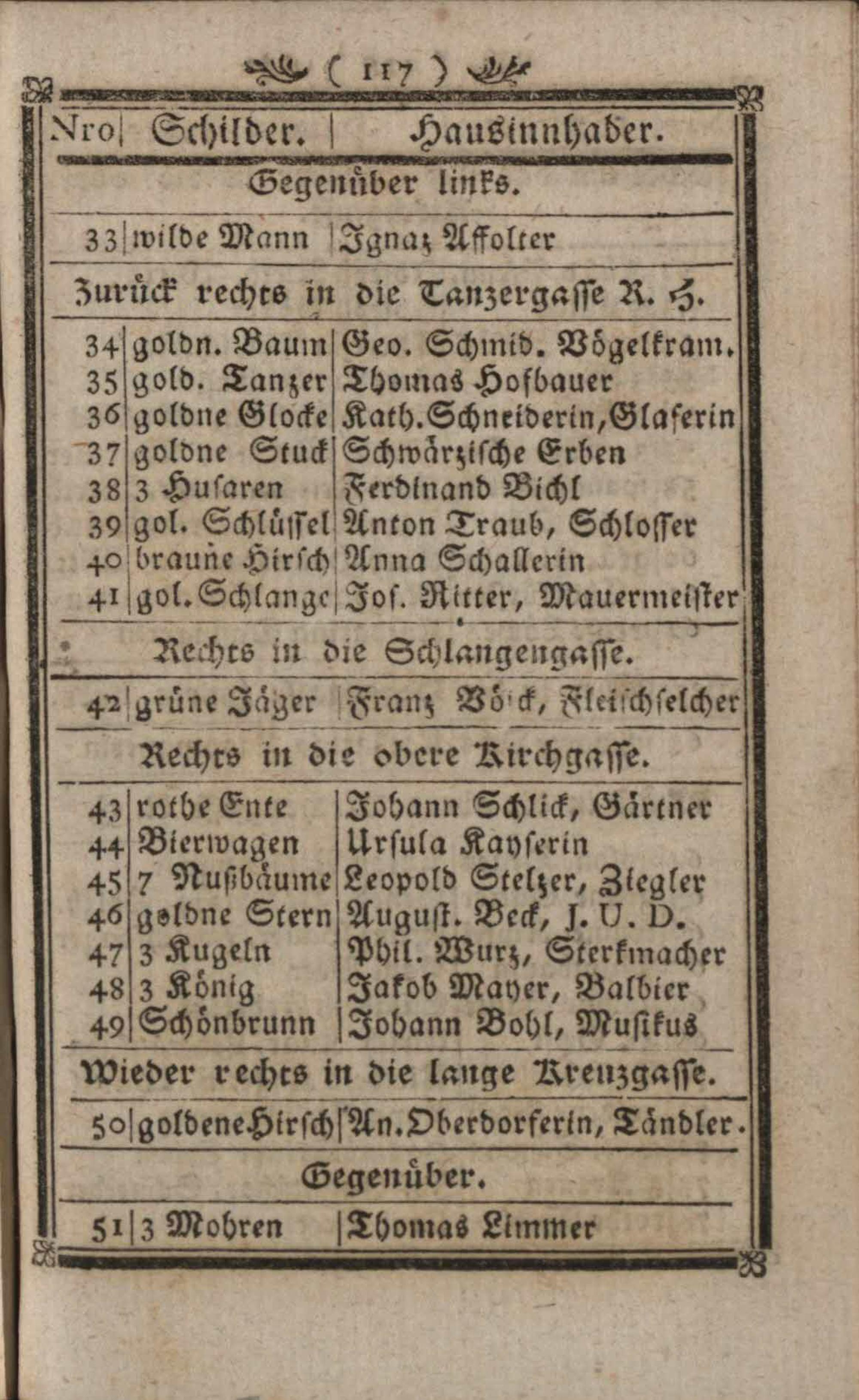 Verzeichniß der um die k. k. Haupt- und Residenzstadt Wien befindlichen Vorstädten, Gründen, Gassen, numerirten Häuser, Innhaber und ihrer Schilder