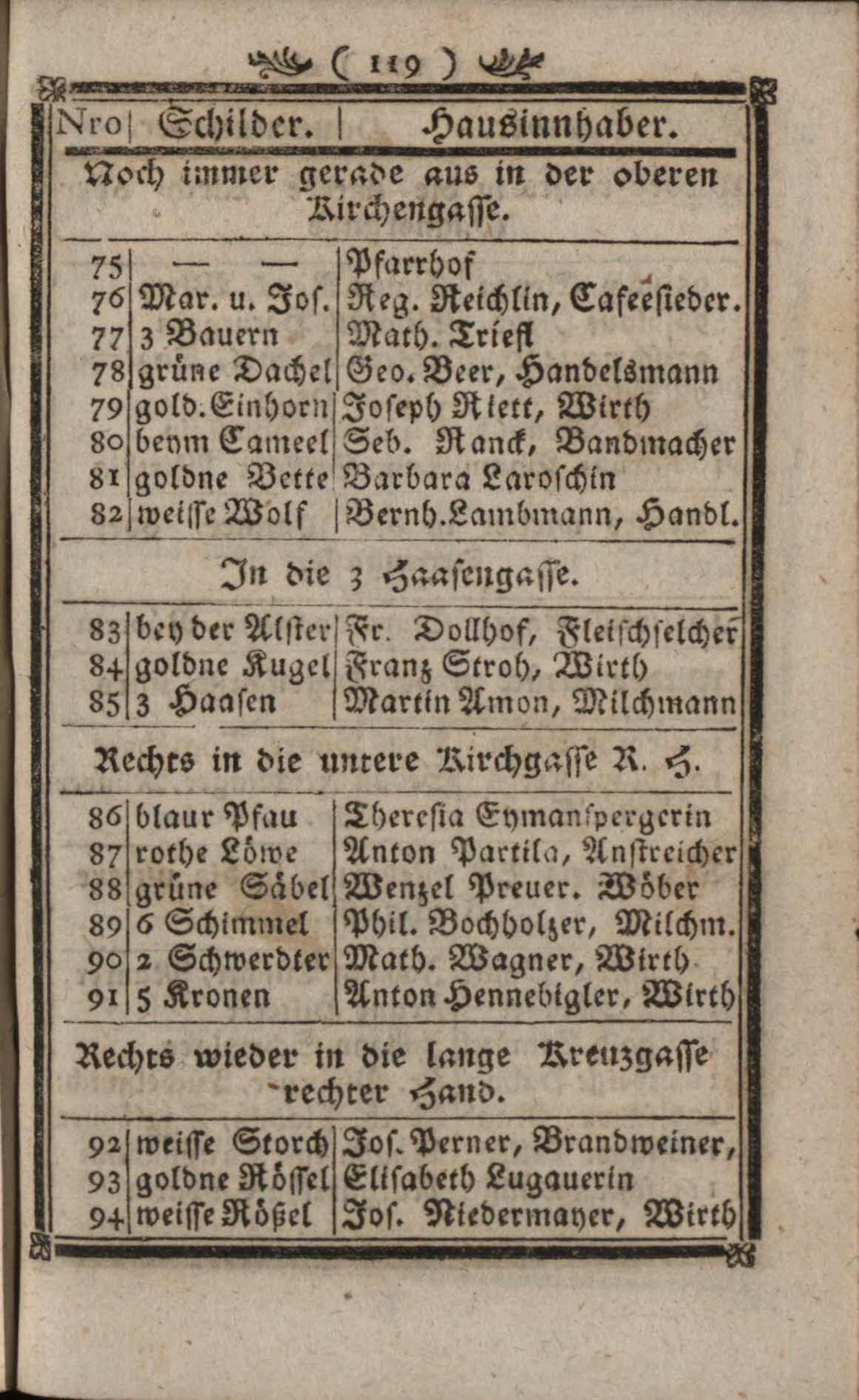Verzeichniß der um die k. k. Haupt- und Residenzstadt Wien befindlichen Vorstädten, Gründen, Gassen, numerirten Häuser, Innhaber und ihrer Schilder