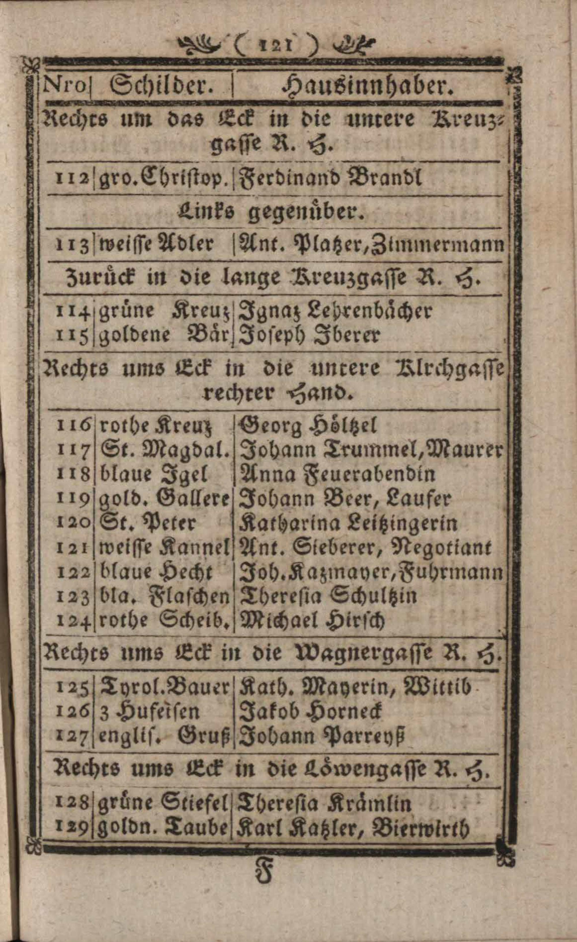 Verzeichniß der um die k. k. Haupt- und Residenzstadt Wien befindlichen Vorstädten, Gründen, Gassen, numerirten Häuser, Innhaber und ihrer Schilder