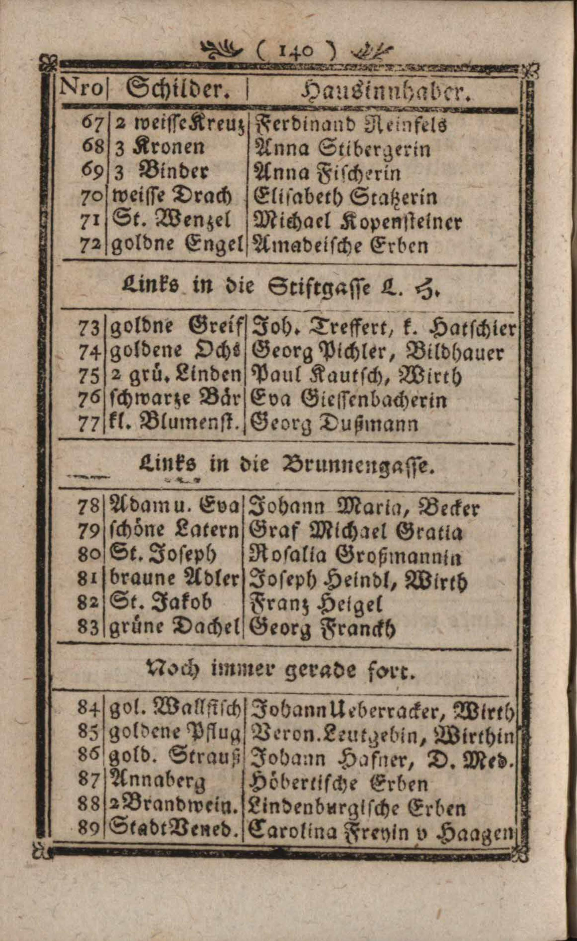 Verzeichniß der um die k. k. Haupt- und Residenzstadt Wien befindlichen Vorstädten, Gründen, Gassen, numerirten Häuser, Innhaber und ihrer Schilder
