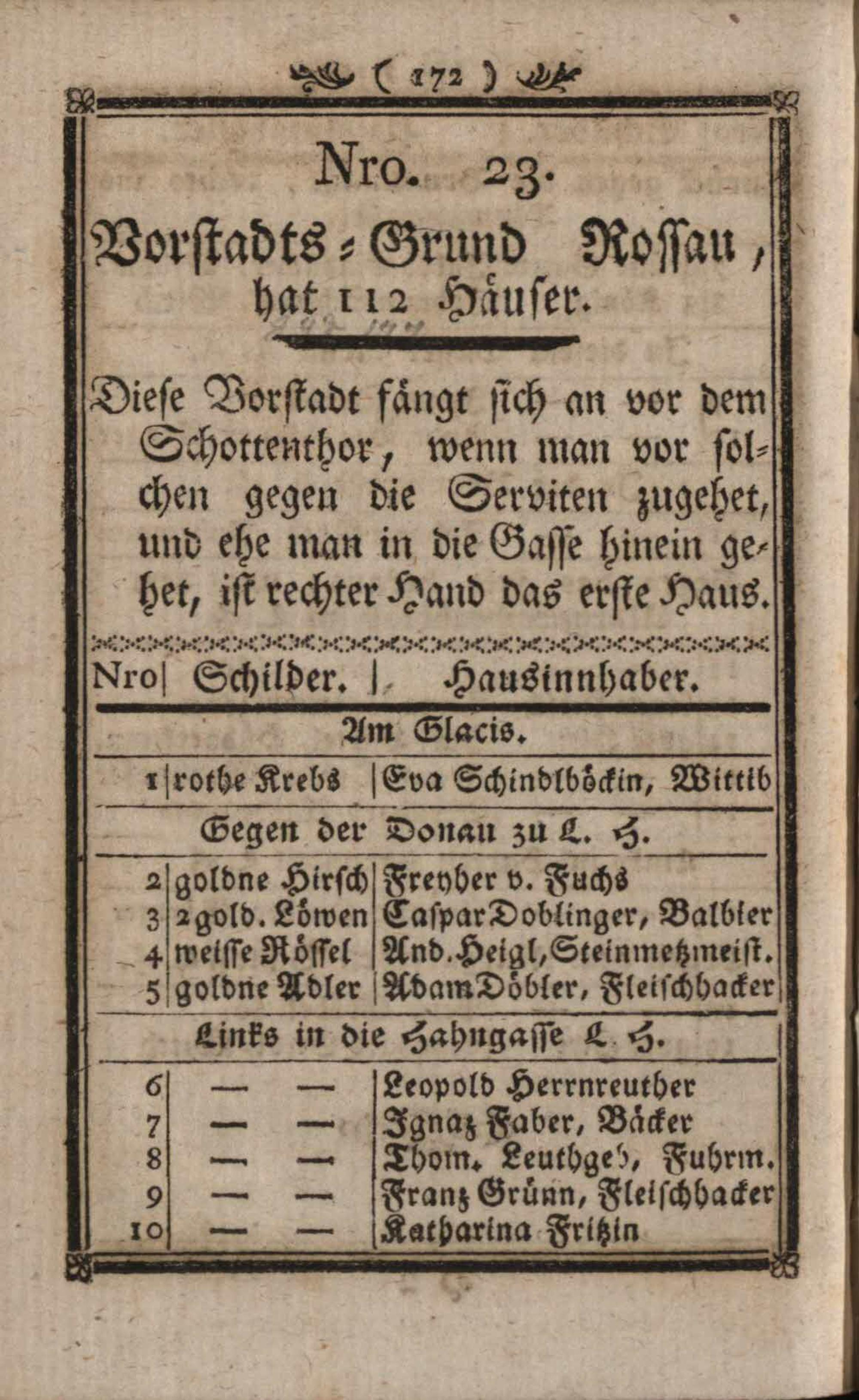 Verzeichniß der um die k. k. Haupt- und Residenzstadt Wien befindlichen Vorstädten, Gründen, Gassen, numerirten Häuser, Innhaber und ihrer Schilder