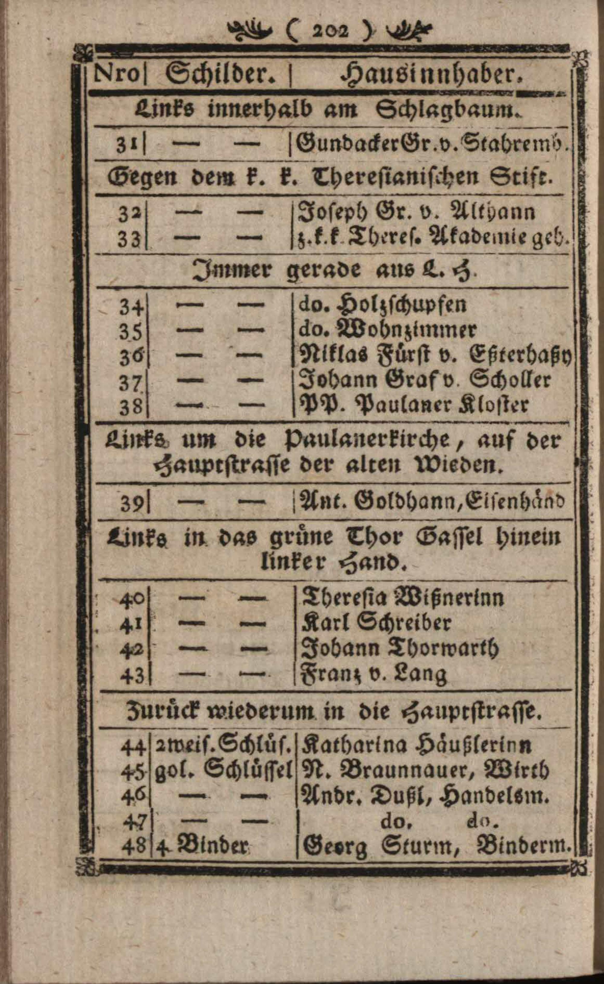 Verzeichniß der um die k. k. Haupt- und Residenzstadt Wien befindlichen Vorstädten, Gründen, Gassen, numerirten Häuser, Innhaber und ihrer Schilder