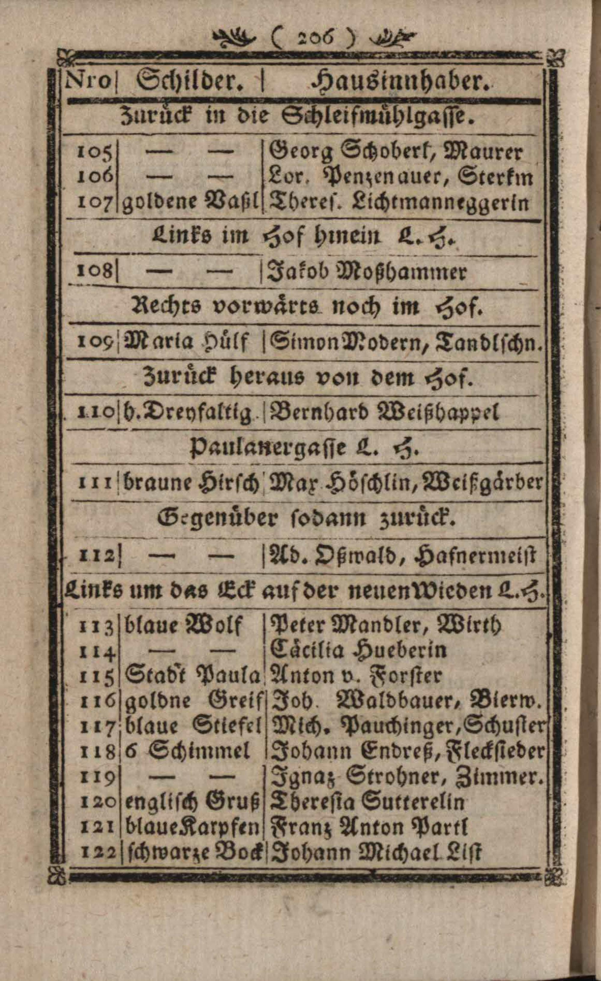 Verzeichniß der um die k. k. Haupt- und Residenzstadt Wien befindlichen Vorstädten, Gründen, Gassen, numerirten Häuser, Innhaber und ihrer Schilder