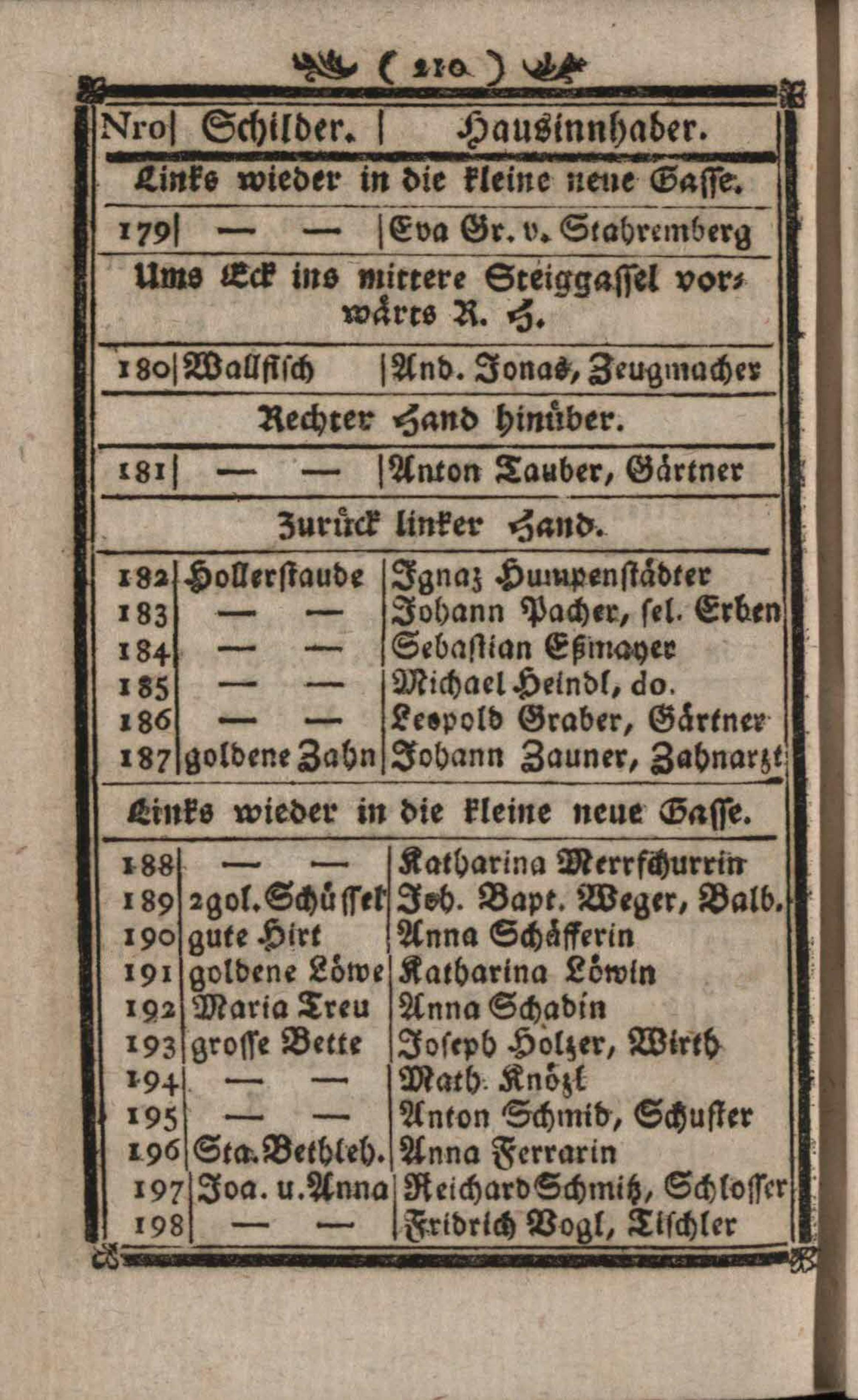 Verzeichniß der um die k. k. Haupt- und Residenzstadt Wien befindlichen Vorstädten, Gründen, Gassen, numerirten Häuser, Innhaber und ihrer Schilder