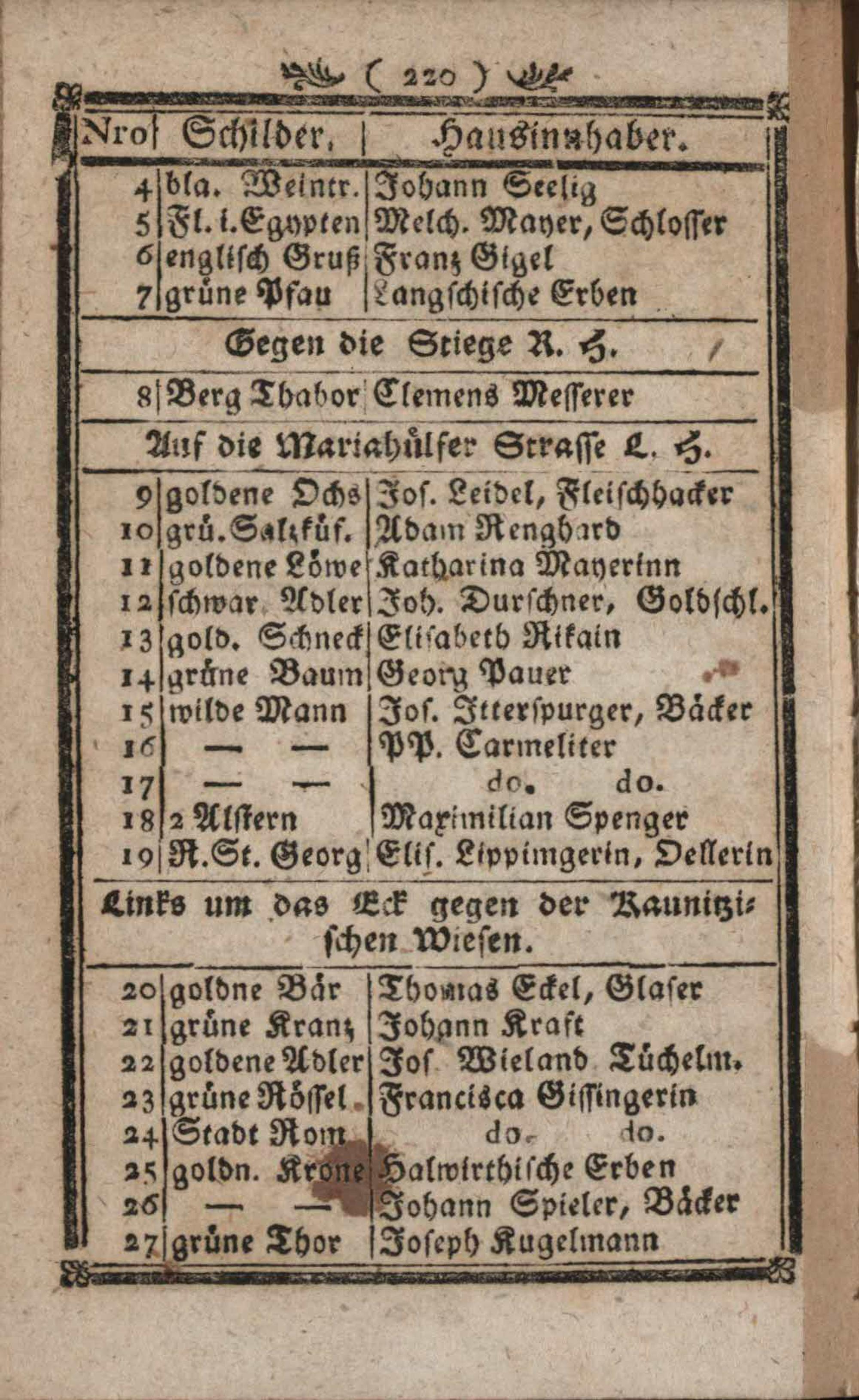 Verzeichniß der um die k. k. Haupt- und Residenzstadt Wien befindlichen Vorstädten, Gründen, Gassen, numerirten Häuser, Innhaber und ihrer Schilder