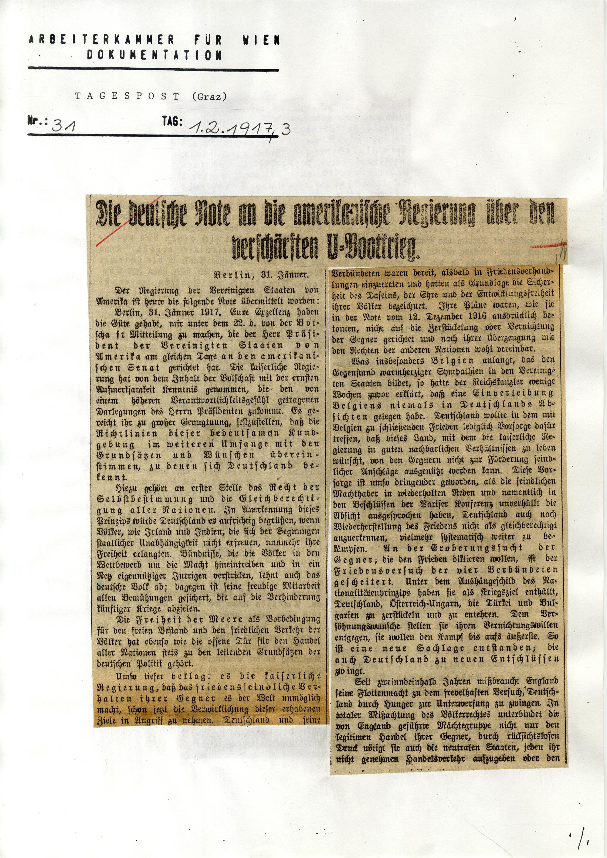 1917 (1917) Erster Weltkrieg : [Sammlung von Zeitungsartikeln]