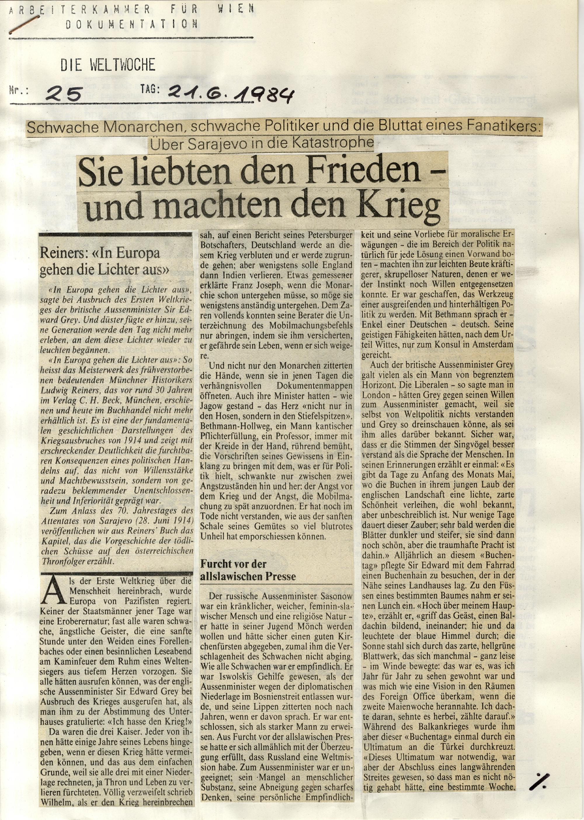 1994: Erster Weltkrieg : [Sammlung von Zeitungsartikeln]