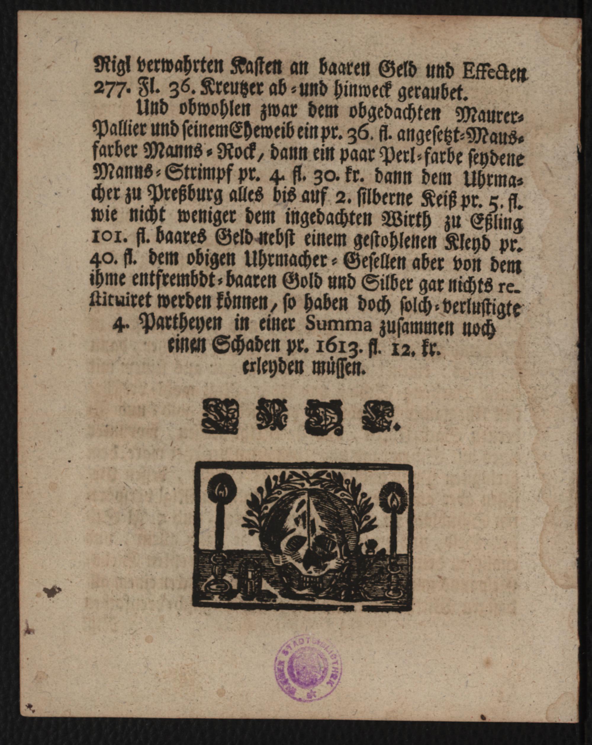 Wohl-verdientes Todtes-Urtheil, Einer ledigen Manns-Persohn, Nahmens Johann Georg D. Catholischer Religion, allhier zu Wienn gebürtig, seines Alters 36. Jahr : Welcher heut Dato den 9. November 1745. wegen ver-schiedentlich auf das neue begangenen Diebstählen auf dem Wienner-Berg mit dem Strang vom Leben zum Todt hingerichtet wird