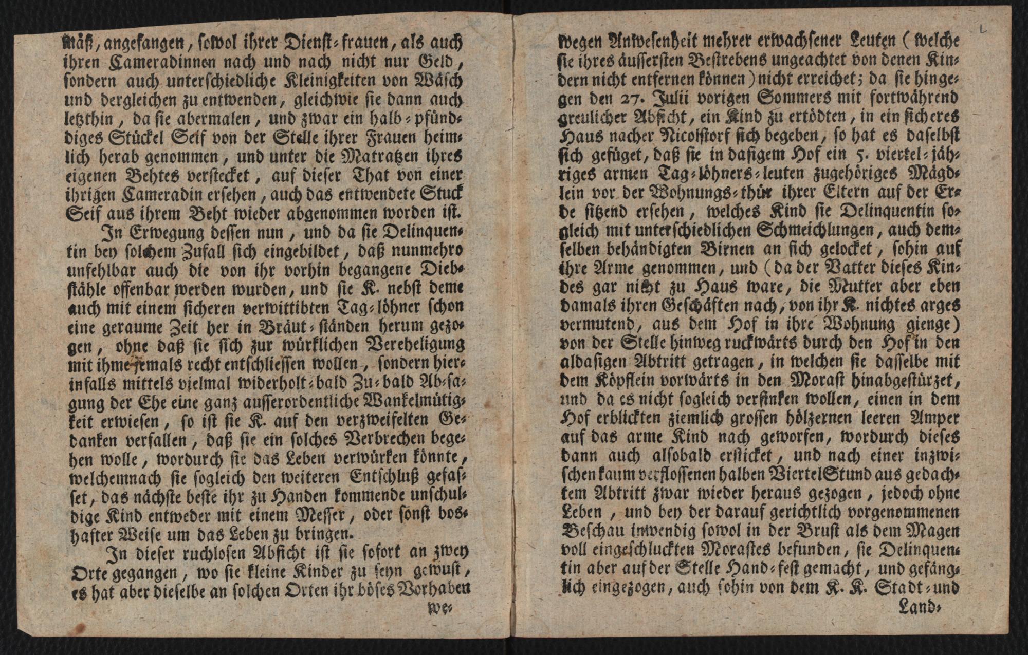 Todtes-Urtheil Einer ledigen Weibs-person, Namens: Clara K. Alt 29. Jahr. Von hier gebürtig, Catholischer Religion : Welches in Folge der bey dem alhiesig- Kaiserl. Königl. Stadt- und Land-gericht wider sie abgeführten Criminal-verfah-rung ... an gleich benannter Clara K., einer Dienst-magd ... heut den 24. November 1759. alhier vollzogen wird