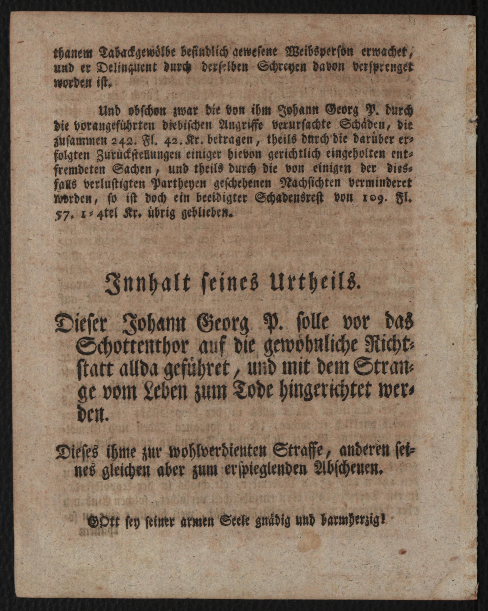 Todes-Urtheil einer ledigen Mannsperson, Namens: Johann Georg P. alt 24. Jahre, zu Kirchdorf in Oberösterreich gebürtig, und Catholischer Religion : Welches in Folge der bey dem allhiesigen Kaiserl. Kön. Stadt- und Landgerichte wider ihn abgeführten Criminalverfahrung ... heute den 31. Jänner 1771. allhier in Wien vollzogen wird