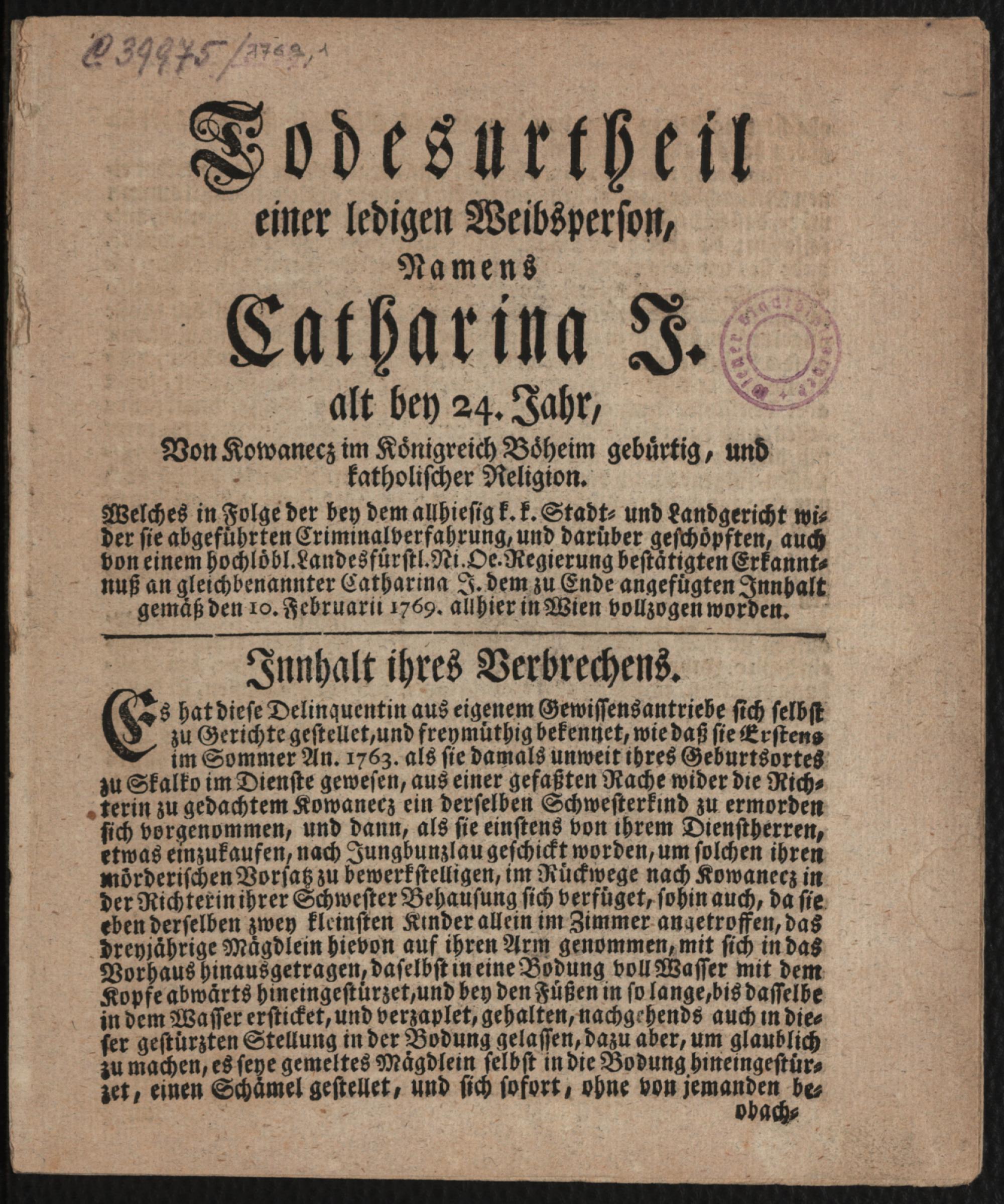 Todesurtheil einer ledigen Weibsperson, Namens Catharina J. alt bey 24. Jahr, Von Kowanecz im Königreich Böheim gebürtig, und katholischer Religion : Welches in Folge der bey dem allhiesig k.k.Stadt- und Landgericht wi-der sie abgeführten Criminalverfahrung ... dem zu Ende angefügten Innhalt gemäß den 10. Februarii 1769. allhier in Wien vollzogen worden
